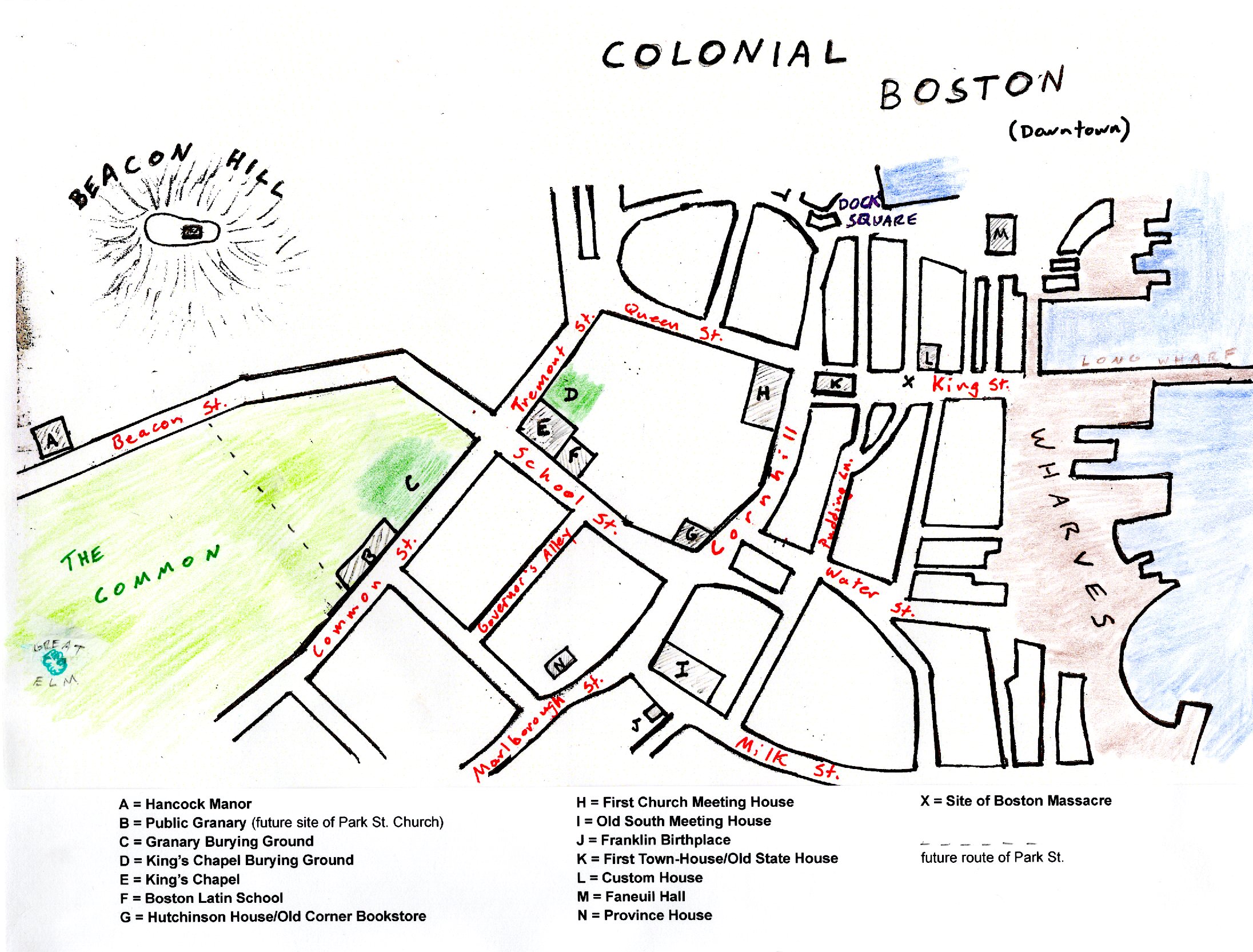 Hanover Square at roughly the center of this image. The Elliott property would be the rectangle on the right side of Orange between Essex and Beech. Boston Common (and its Burying Ground) are off to the left