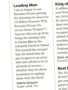 This sinister, subtle change began being reflected in the Letters section. It began to sound like the Letters section in People. (Want a good laugh? Read the letters people send to People. If you find this country’s tailspin into mediocrity and intellectual softness as grimly amusing as I do, you will truly soil yourself over the Letters section of People.) Here’s a brief taste of this week’s Letters section of EW: “I am so happy to see Brendan Fraser getting the attention he deserves…It’s about time we give respect to an actor who isn’t afraid to be in all kinds of movies…” My word, that’s a bold statement, Valerie Grayson of Sugar Land, Texas. Perhaps if you move