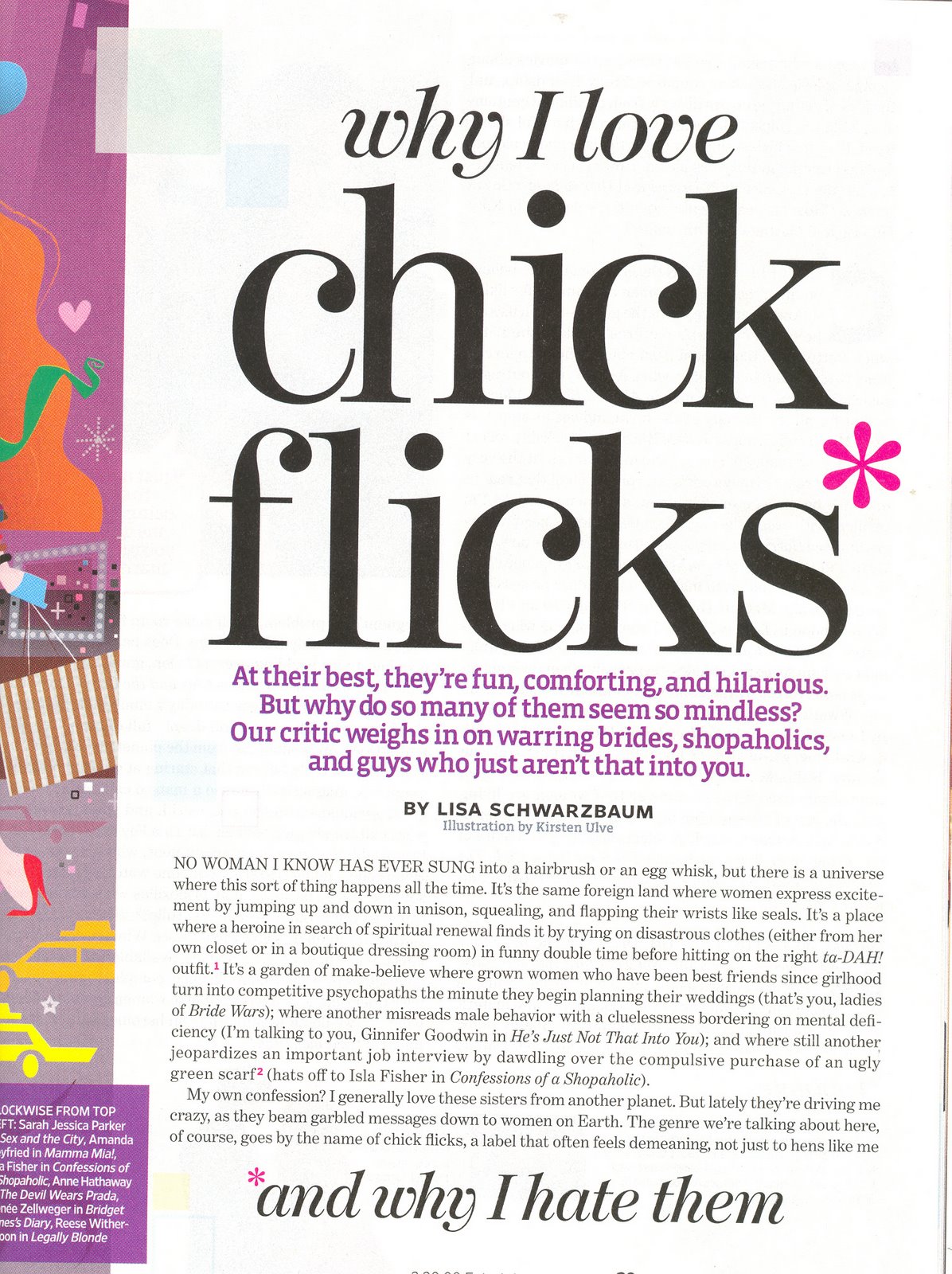The downward slide started awhile ago (two years? three?) with some layout changes that I, the reader, was assured would be purely cosmetic, and the content would remain unaltered. I wanted so badly to believe that. But I began to notice a shift in emphasis. The stories got dumber. The celebrities they chose to feature got better-looking and less talented. Real interviews disappeared, and were replaced by fluffy public-relations ass-kissery. The film reviews and criticism lost their bite, and favored romantic comedies.