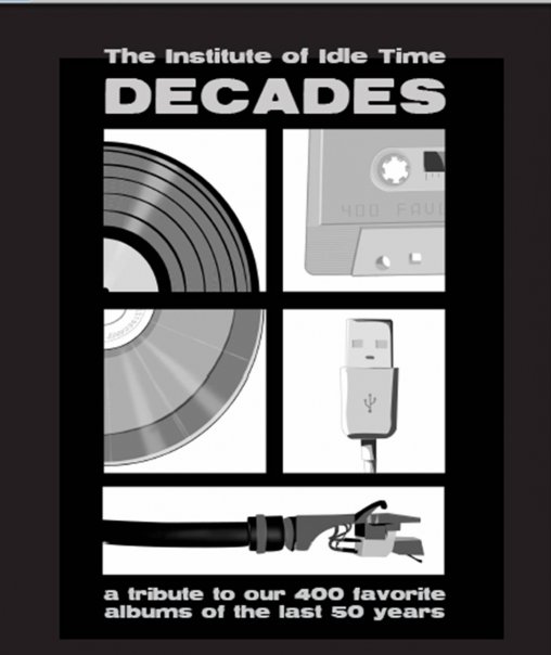 A number of developments marked the last few weeks of August for the Institute of Idle Time “collective.” First of all, WH and I went back to work after a summer break (MDG runs a summer camp, so no break for him, poor chump), and our place of employment is under new management. Second of all, our grand project — DECADES — hit the streets on August 21st. A thought-provoking, argument-starting ranking of our favorite 400 albums of the past fifty years, complete with individual write-ups for each album. It’s published by ComiXpress and written in large part by the membership of the Institute of Idle Time. (If I’ve never introduced them by name officially in this forum, they are: myself, MDG, WH, RF, 3D Chain, Arcturus the Boy-Tune Wonder, and JH. For a reminder of what we’re all about, click here.) Even the seven of us could not possibly do write-ups for 400 albums in the time we had, so there are also contributions from over thirty of our friends and family. You might know one. You might be one. It’s a damn good bathroom read, contains original art by Jim Shepherd and photography by John Muheim and George Umpingco, and looks nice on a coffee table. Copies are available through me for $12.