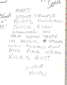 Allen mentioned Pink Viking in the same breath as the Rolling Stones, and joined the chorus of Stone Temple Pilot-haters when he signed my yearbook a week later. He directed his ire regarding to STP to mutual acquaintance Ryan S. for reasons lost to the mists of time. I don’t recall Ryan being any kind of advocate for STP at any point.
