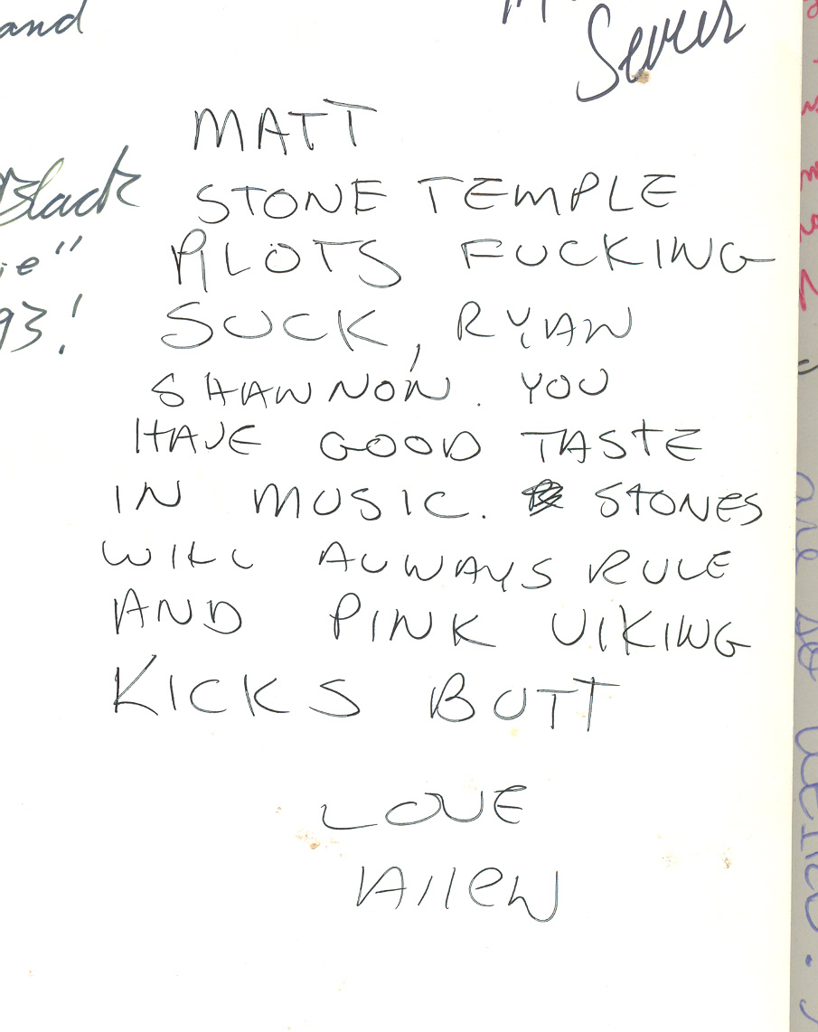 Allen mentioned Pink Viking in the same breath as the Rolling Stones, and joined the chorus of Stone Temple Pilot-haters when he signed my yearbook a week later. He directed his ire regarding to STP to mutual acquaintance Ryan S. for reasons lost to the mists of time. I don’t recall Ryan being any kind of advocate for STP at any point.