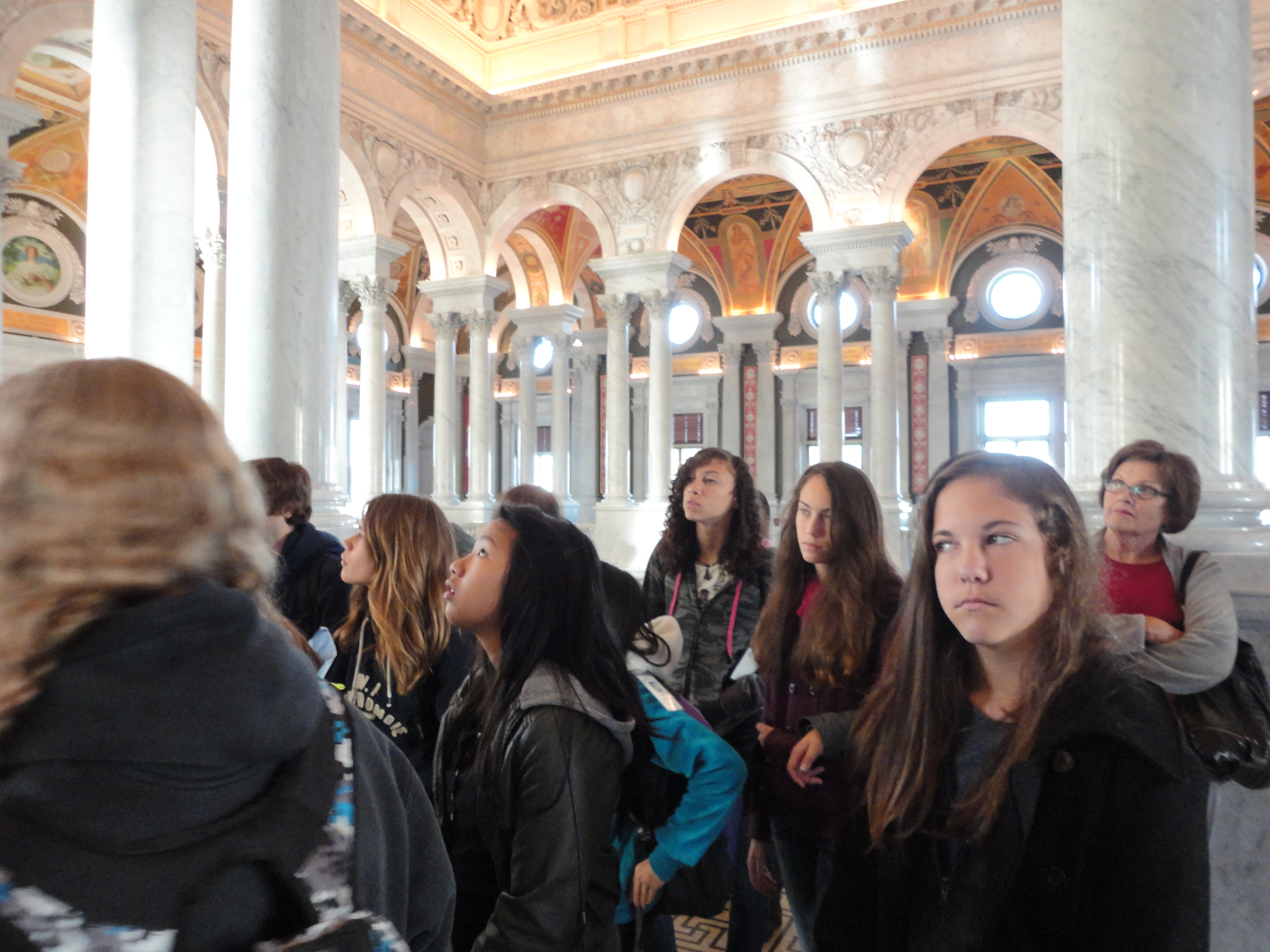 As I stared at the rotunda ceiling above the Main Reading Room, which is lavishly illustrated with murals and ringed with statues depicting literary giants, I heard an odd rasping sound behind me. I turned, and was treated to a view of about a half-dozen of our kids, slumped against each other on a priceless Beaux-Arts rococo bench. One of them was lightly snoring, but the most zonked-out was Beverly, who had been the #1 malingerer of the trip, always the last in line, always slowing everyone down with her shuffling and whining, and always absolutely 100% uninterested in anything that was passing in front of her dim, Kristen Stewart-ish dead-fish eyes, which betrayed not a spark of engagement. A swift kick was enough to get them somewhat re-energized, and we moved on to one of the most remarkable parts of the library tour.