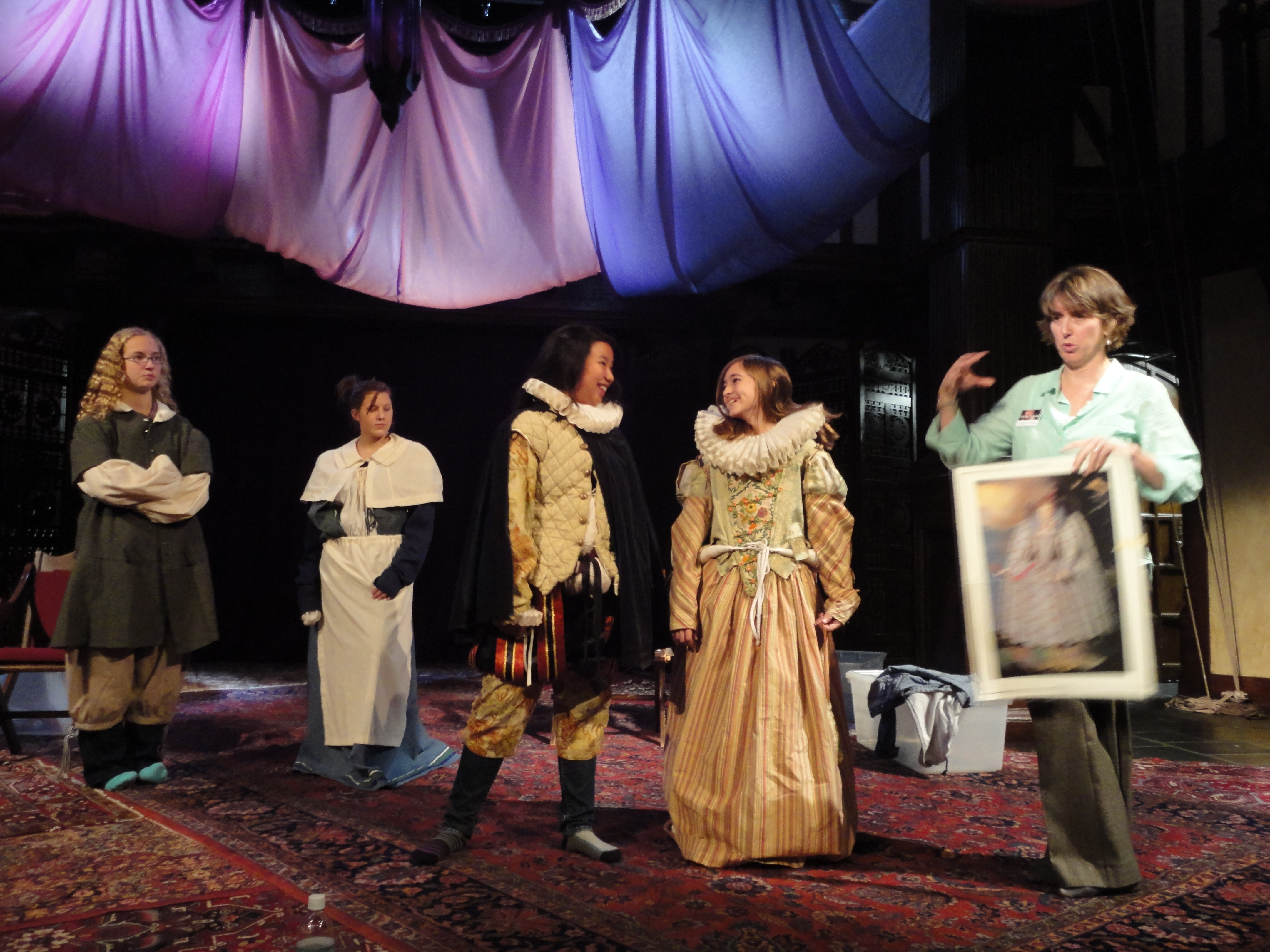 The kids were put through their paces in the Elizabethan Theatre, learning about the stagecraft and costuming of the Shakespearean era, most of which they had already learned in MDG’s class (though that didn’t stop them from clamming up and sitting on their hands when asked questions by the presenters — all except Sandi, whose answers were invariably enthusiastic but wildly incorrect.)