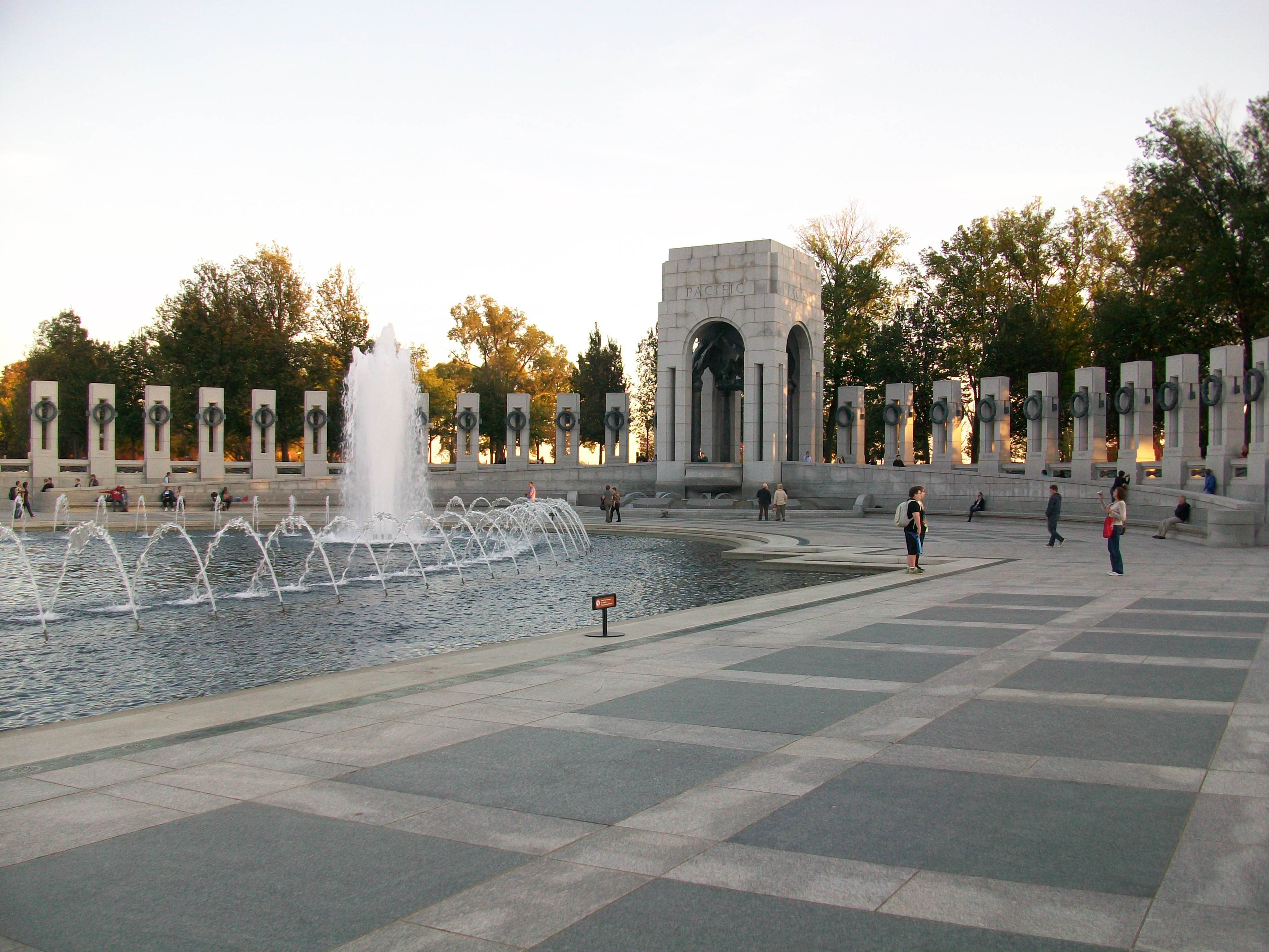 With Washington checked off, why not Lincoln? The Lincoln Memorial was just a little ways off. Or so it appeared. The actual distance (I just checked) is eight-tenths of a mile, coverable by a healthy adult at strolling speed in about twenty minutes. But with nineteen exhausted middle-schoolers plodding grimly along, it took closer to forty. While waiting for stragglers to close up the end of the line, I took a few minutes to slip off by myself to get a look at the relatively new World War II Memorial which is located between the Washington Monument and Lincoln Memorial (and, ironically, within view of the German-American Friendship Garden). A few minutes were all I had, because time had now become a serious factor.