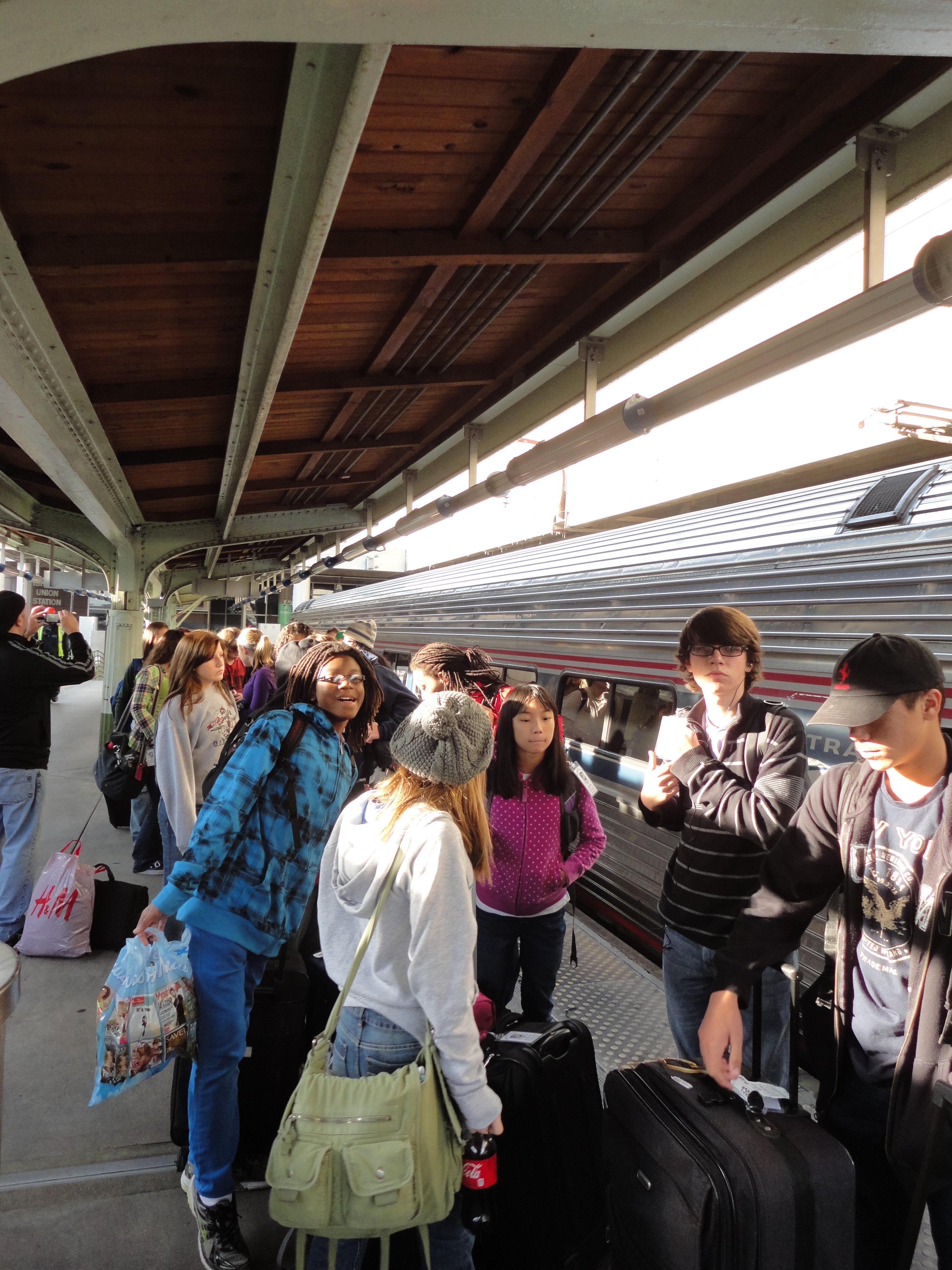 MDG was already in the hotel dining room sipping coffee when I arrived. He commented admiringly on my shirt (fronted by an eye-wateringly bright pattern of neon 80’s-style louvered sunglasses) and said that Our Principal would remain behind with Elizabeth and take a later train to NYC, and if necessary cart her to Aunt Veronica’s for some old-school chicken soup nursing. The student number was cut to eighteen, and the chaperone number cut to two. I was being bumped from my cushy Number Three in Authority spot to a more uncomfortable and responsible Number Two. “Shit just got real, son,” is how MDG put it. By the time everyone was fed and organized, there were two remaining shuttles from the hotel to the train station, and the twenty of us piled ourselves and our luggage into them. Each van looked like a phone booth stuffed full of bodies for a frat-house prank, and I spent the ride to Union Station with someone’s hipbone jammed painfully into my thigh.