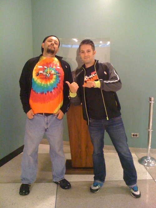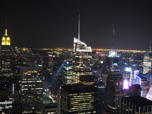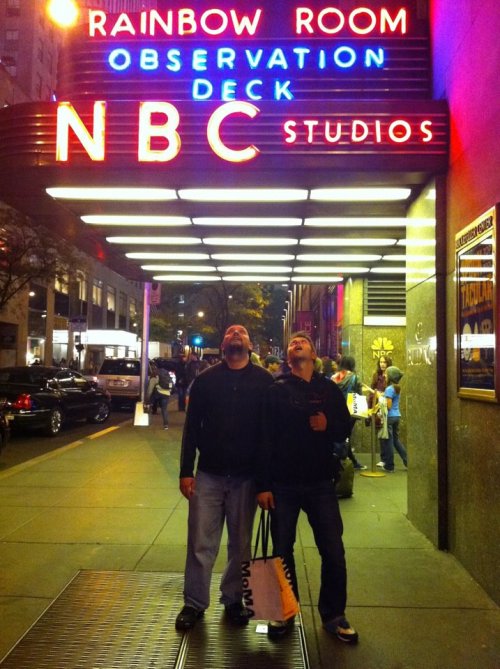 We were ushered into 30 Rock, past a wall-sized screen showing highlights from the GE Building’s (RCA Building until 1988) storied history toward the elevators — glass-ceilinged elevators, which were a little unsettling as they shot us upward sixty-plus stories at approximately 5000 miles per hour. The group oohed and aahed over the the night-time Manhattan skyline, snapped pictures that mostly just reflected off the plexiglass safety walls, then took the less scrotum-shrinkingly intense ride down to the bottom. The restrooms that everyone decided they needed desperately at that point were located off a food court next to the famous Rockefeller Plaza ice-skating rink, abandoned at this hour and looking much smaller than it does on TV.