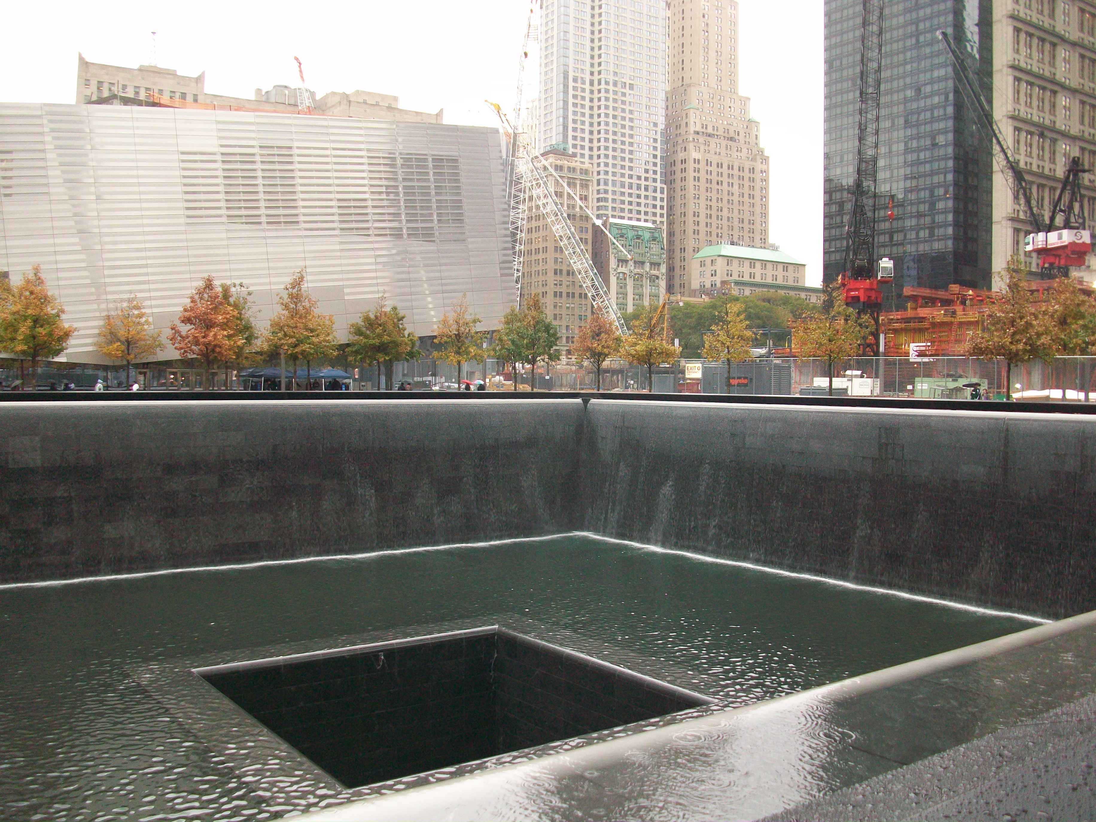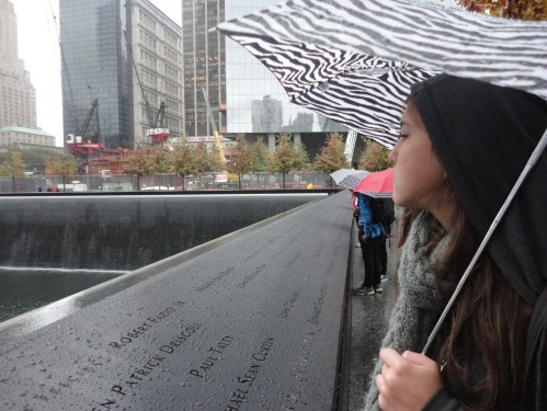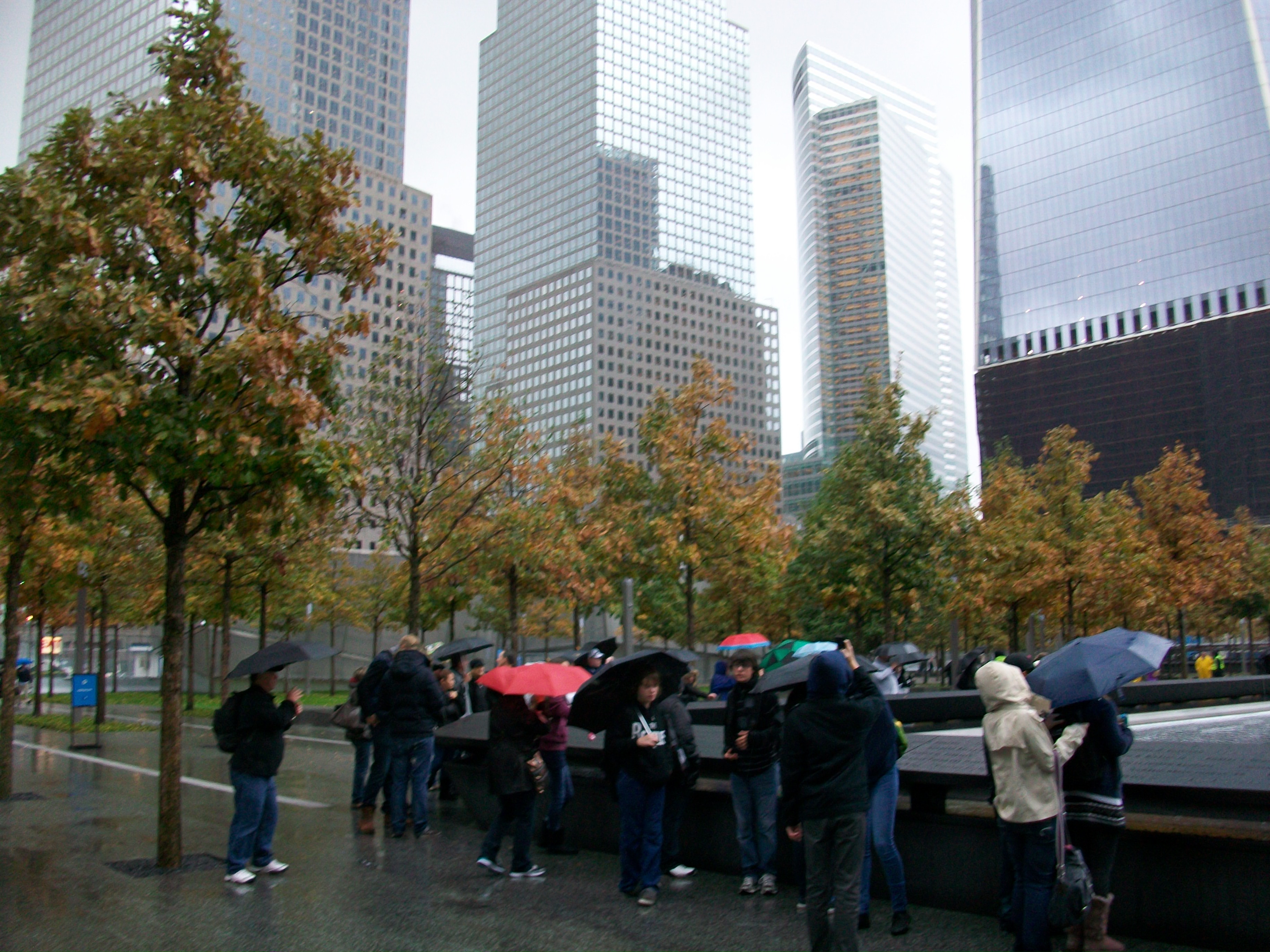 The National September 11 Memorial & Museum, 1:07 p.m. The area that was once the World Trade Center was still basically a huge construction zone. We got wetter by the minute as we snaked our way through an insanely long line, past tarps, scaffolding, cyclone fencing, and open, muddy pits. The only people who looked wetter and more miserable than us were the Occupy Wall Street protesters living in their tent city in Zuccotti Park. The new One World Trade Center (formerly the “Freedom Tower”) loomed over us, nearly completed. We wondered how much more crowded it would be if there weren’t a monsoon currently in progress.