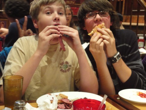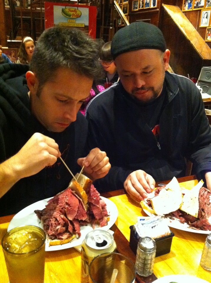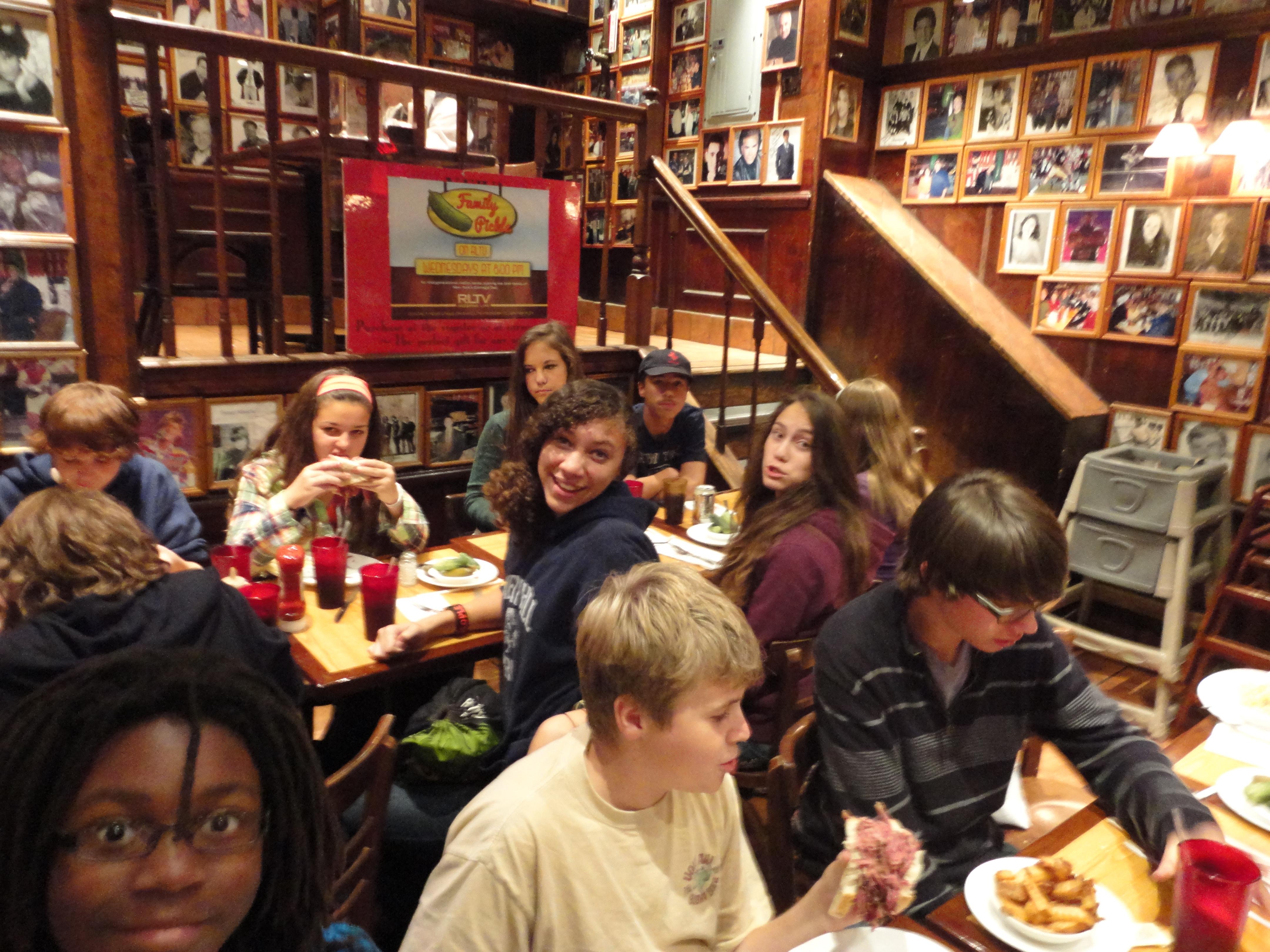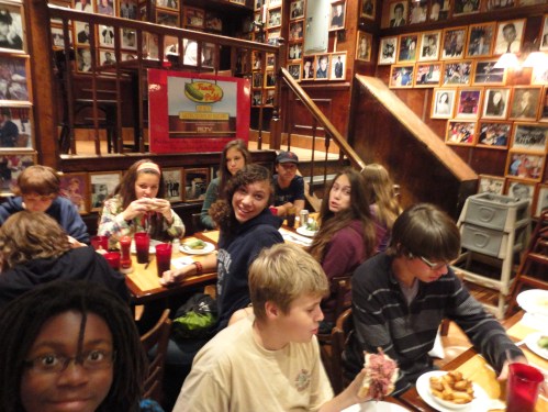 As sunset rapidly approached, we all began to feel a distinct rumbling in our stomachs, the fare from the Amtrak dining car having long been burned off. Since our itinerary was planned to a T by Our Principal (still in absentia, remember, with the flu-stricken Elizabeth), our dinner reservations were just a few blocks away…the world-famous Carnegie Deli.