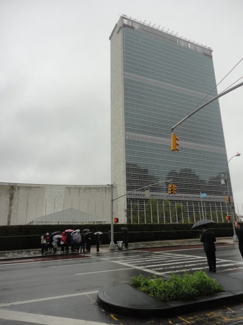 Thursday, October 27, 2011. The United Nations Headquarters, First Avenue, 9:02 a.m. Bad weather rolled in early Thursday morning. Wind, rain, and bone-chilling temperatures greeted our awakening, and dogged our every step through the day. Today would supposedly feature the primary reason for the entire trip — a visit to the United Nations, where the inventions created by the “Design For The Other 90%” innovators were on display…in what appeared to be the basement. Little blue notebooks in hand, the kids prowled the displays, in search of inspiration for their own original designs, which they would pull together in the spring semester.
