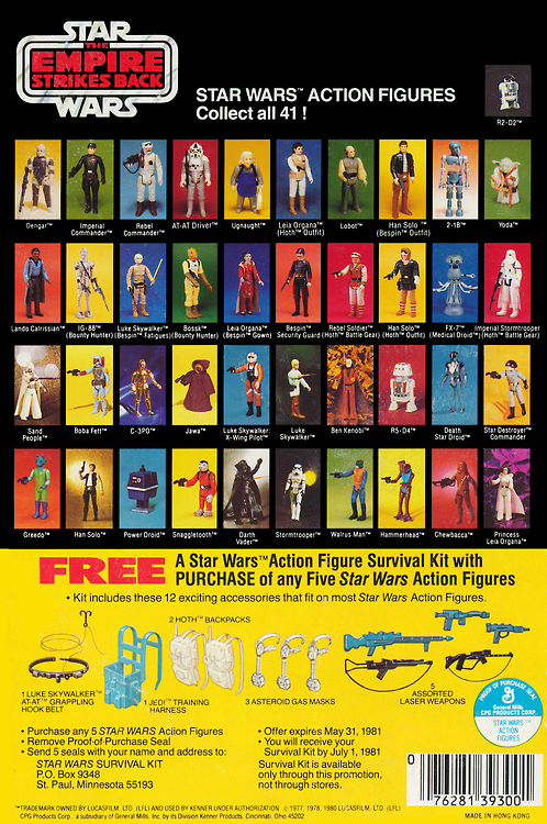 A cardback from around the time I started collecting the figures. There were 41 at the time. Yes, I sent away for the survival kit.