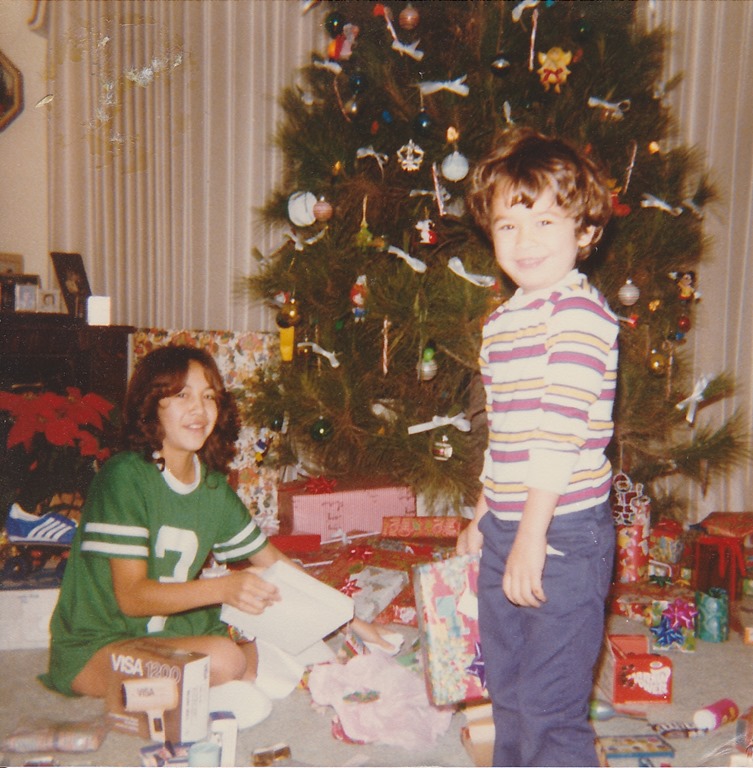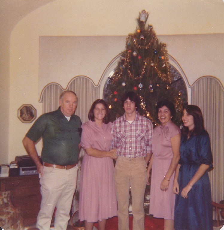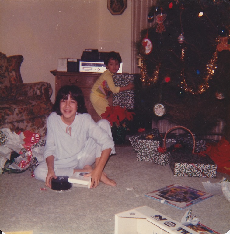 It might have been on Christmas Eve, or a night or two before, that Mom got the idea to drive around to all of our relatives’ houses and take pictures of them in front of their Christmas trees. The only surviving pic from that series is of my Aunt Thana and the two daughters that still lived at home, Kelly and Leah. Leah, 7, had the flu and was running a fever (obvious in the pic below), but took the time to run into her room and laboriously gift-wrap a tiny rubber King Kong finger puppet as my Christmas gift.