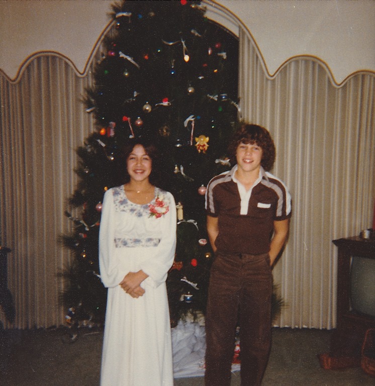 Lori and her date for the 8th grade Christmas dance. This poor bastard has no idea his 70s-‘fro and brown corduroys are now on the Internet for all to see. The inappropriately big-titted angel hovers between them.