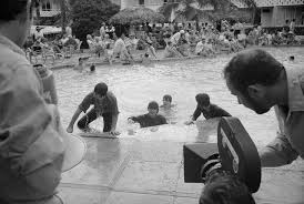 February 23, 1965 — Cameras began rolling on what was at that point called Beatles 2 at the Nassau Beach Hotel in the Bahamas. The scene in question is where the Beatles emerge fully-clothed from a swimming pool, having followed an underwater tunnel from Clang’s temple.