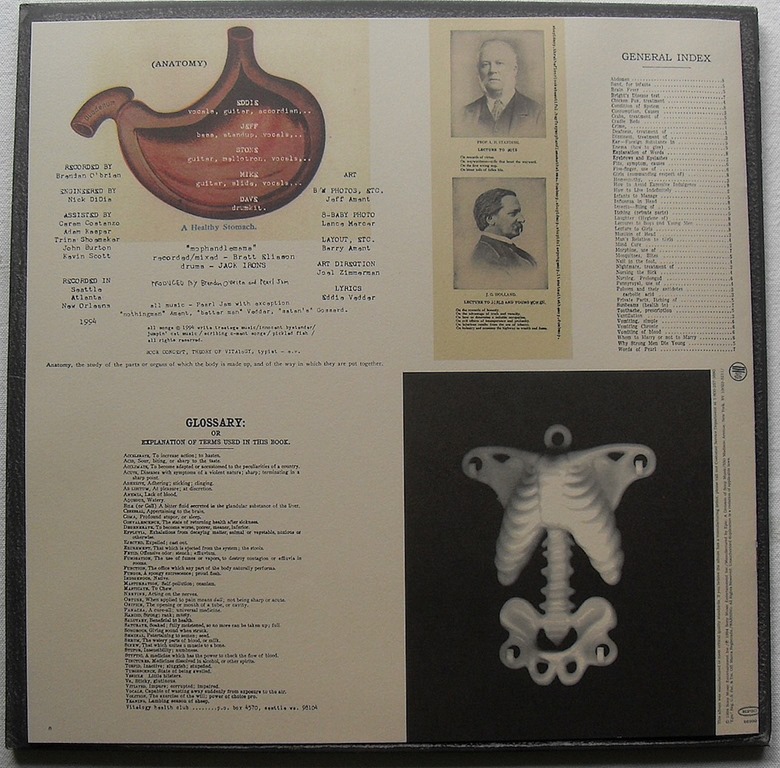 Vitalogy suffered from the “third album” curse, typical for bands who were very successful with their first two albums — their ego and budget were inflated to the point where every idea was a good idea, they decide to get “experimental” resulting in at least four tracks of non-musical self-indulgence, and the CD packaging becomes some kind of modern art exhibit. In Vitalogy’s case, the CD came wrapped in several reproduced pages of a 1920s medical textbook, along with other random scribblings. Pearl Jam was/is a solid band, so a few good songs couldn’t be suppressed, with “Better Man” probably being the best of the lot. But when I read recently that rhythm guitarist Stone Gossard admitted “eighty percent of the songs were written 20 minutes before they were recorded” I couldn’t be less surprised. And the small amount of time between Vs. and Vitalogy reflected Eddie Vedder’s publicly