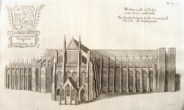 Westminster Abbey as it appeared around 1600. The “new” Lady Chapel built by Henry VII sticks out on the left. Note the lack of massive towers on the right.