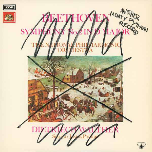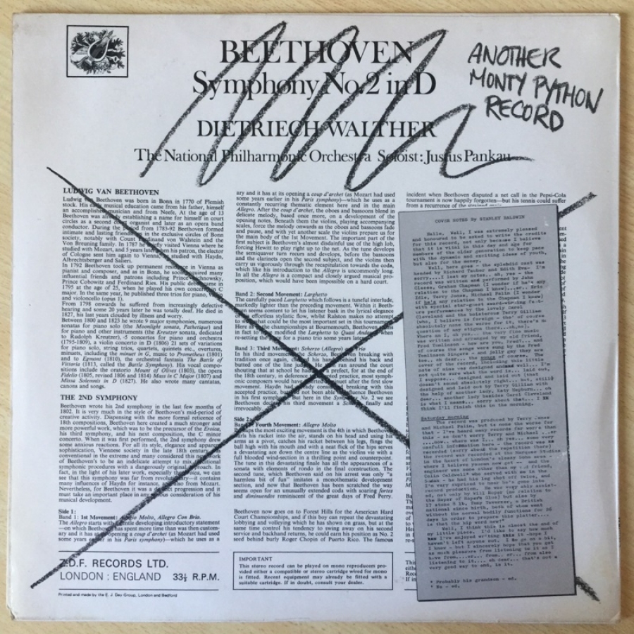 Everything was messed with, beginning with the cover art. A typical staid, bland classical music album jacket was defaced with black crayon to turn it into a Python album. (See below.) The dense collection of small-font paragraphs on the rear cover, typical of high-brow classical vinyl, appears to be an analysis of Beethoven and the musicological details of his second symphony, but gradually more and more references to tennis begin creeping in. A pasted-on addendum detailing the actual album credits was supposedly written by former Prime Minister Stanley Baldwin, who had been dead since 1937.