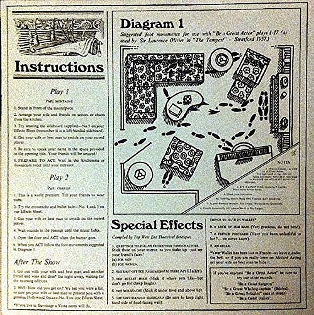The centerpiece of the new, original material is “Be a Great Actor,” an interactive piece where the listener participates in a play by speaking when they hear the buzzer. The original album included a “Great Actor” kit, consisting of scripts, directions, stage plans, cut-out mustaches, and a tiny, cut-out Oscar statuette.