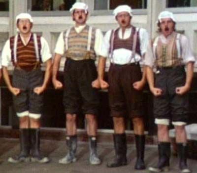 The Pythons tended to eschew recurring characters and catchphrases (making them the anti-SNL), with a few notable exceptions. The Colonel would often show up and stop sketches when they got too “silly.” And a group of odd characters known as “Gumbys” made frequent, if brief, appearances throughout the TV show. They wear an outfit consisting of rubber boots, rolled up trouser legs and sleeves, suspenders, a knitted sweater vest, spectacles, a little toothbrush mustache, and topped themselves off with a knotted handkerchief on their heads. They have permanently clenched fists, and “speak” in hoarse, over-enunciated shouts and are quite clearly dangerous imbeciles. The Gumbys get their chance to shine in an audio format on Another with “Gumby Theater,” an attempt by these bellowing freaks to pull off a radio version of Chekhov’s play The Cherry Orchard.