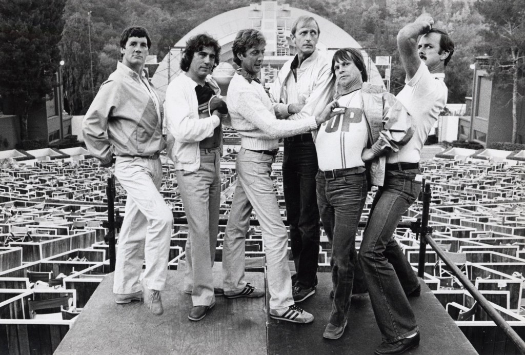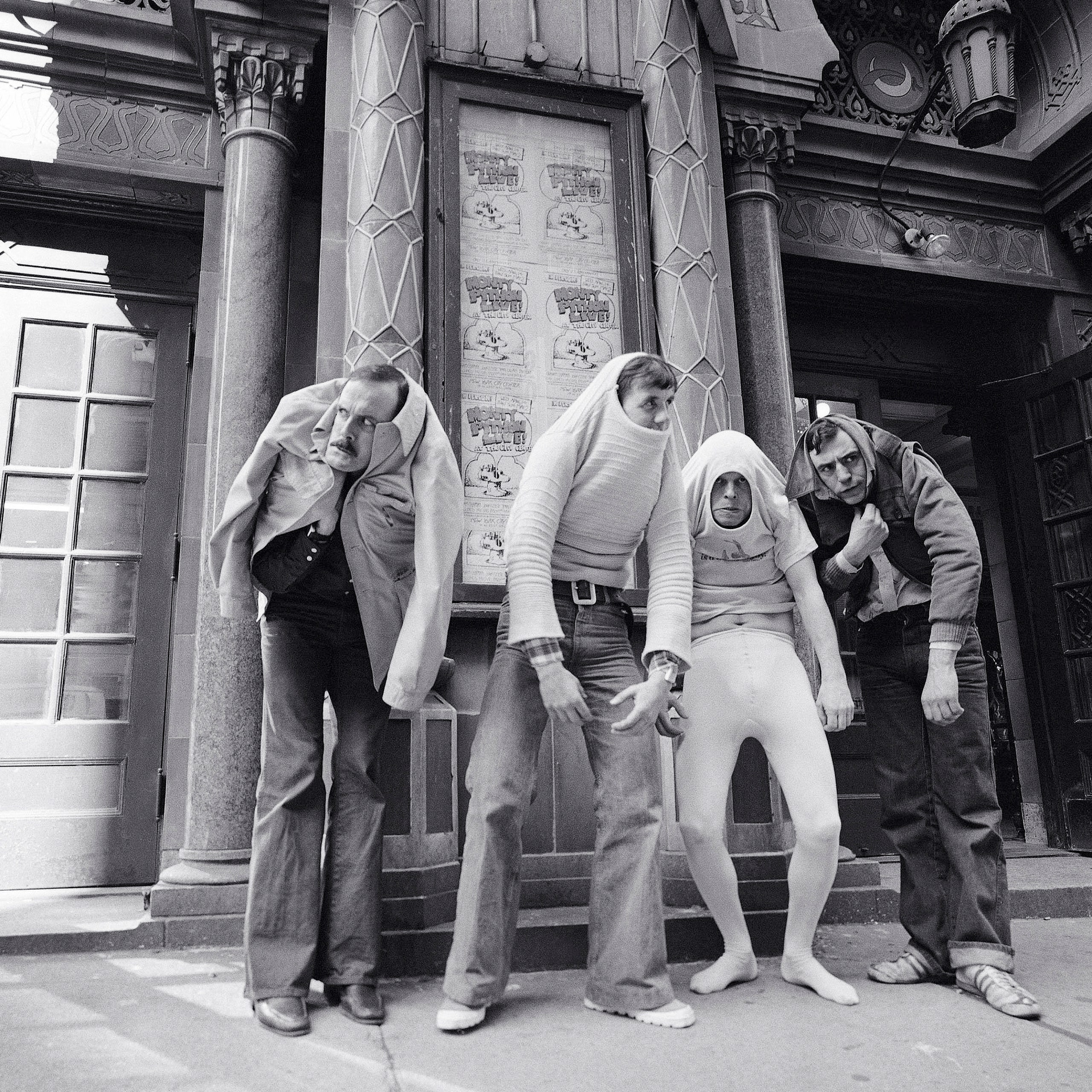 Outside Center Center, April 13, 1976. Graham Chapman appears to have wandered off for a drink, and has been replaced here by Neil Innes
