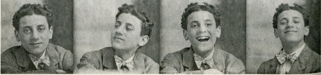 Some of the Marxes, around 1904…Julius dotes on Minnie as Frenchie stares down the camera. Herbert and Milton flank the girl, who Robert Bader’s book identifies as cousin Polly, but she looks awfully young to be a 20-year-old wife. I think it’s another Schoenberg cousin (there was evidently no shortage of them).