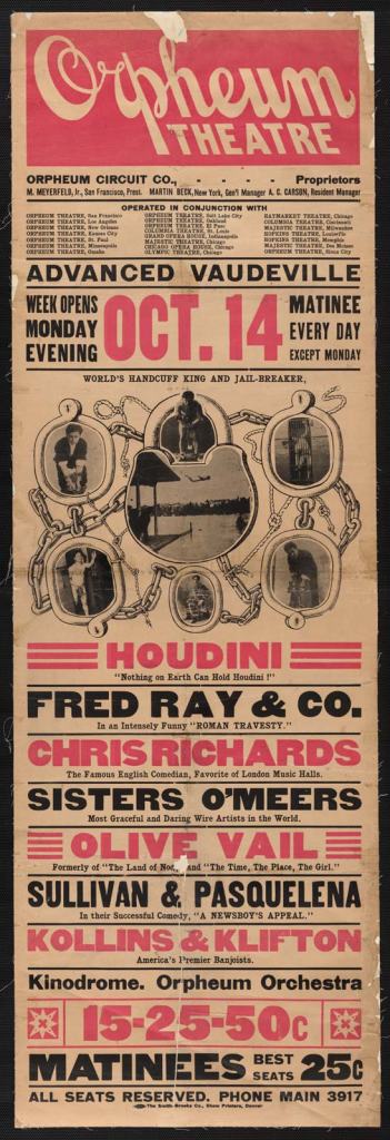 It was the most popular form of American public entertainment from the 1890s to the 1920s. Vaudeville shows consisted of a series of short, unrelated acts (usually performed twice a day, sometimes three times a day, sometimes more) designed to give an audience a wide-ranging show at an affordable price. In a single production, an audience might see magicians, ventriloquists, dancers, musicians, acrobats, one-act plays, and plenty of vaudeville’s two most common types of performers — singers and comedians (and singing comedians, and comedic singers). Vaudeville shows toured cross-country circuits, and when one show left town after a week or so, it wouldn’t be long before another arrived.