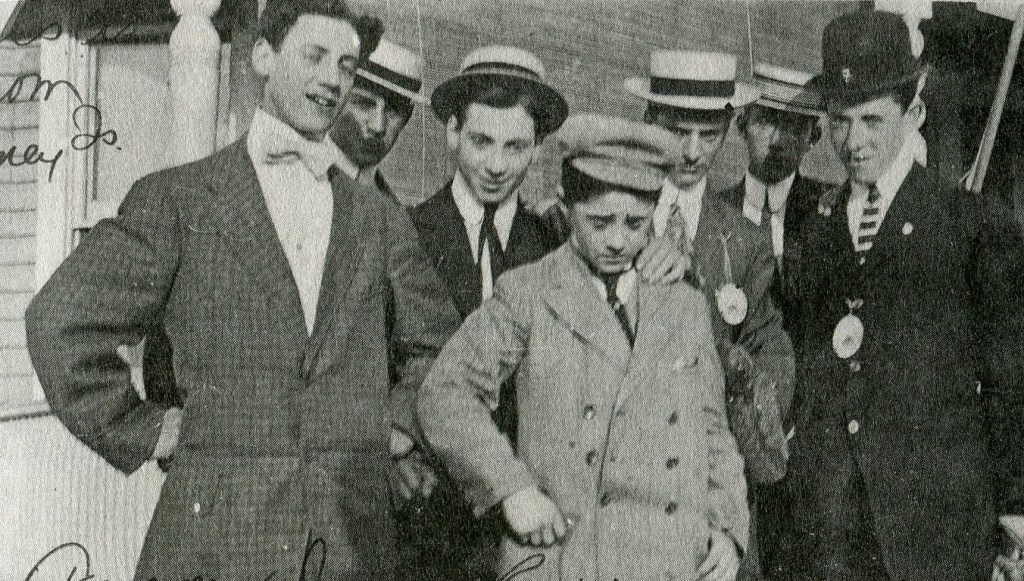 The Four Nightingales make their debut. Adolph clutches Lou Levy by the shoulder. The three men on the right are unidentified — Coney Island, June 1908