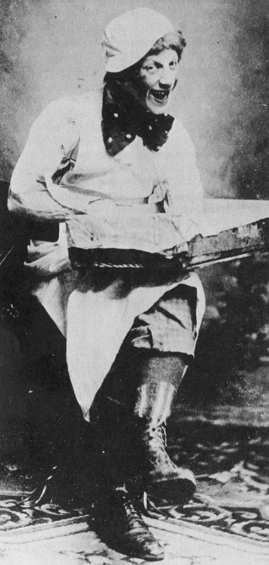 Although The Four Nightingales’ show was essentially a musical act, comedy had been a part of it from the very beginning, when Julius would do a little between-song patter, often in a comic German accent (in imitation of Uncle Al.) An early review in a New Jersey paper stated that “Julius and Milton Marks [sic]…are not only good singers but clever comedians, too.” Not everyone was so appreciative. “[They] are wasting a good deal of valuable time in the exploitation of ineffectual comedy and dialogue,” read a later review. “The greater part of it could be dropped altogether, and the precious moments thus saved devoted to more singing.” (Evidently this reviewer did not share Julius’ disdain for their voices.) If the boys even read these reviews, it didn’t put them off their new direction. More and more comedy began creeping in, until Julius had developed his first full-blown comic character — “Hans Pumpernickel,” the German butcher boy. He ditched his white suit in favor of a grocer’s apron, a blonde wig (one of Minnie’s cast-offs), blacked-out teeth, and a basket of rubber frankfurters. His star turn was the comedic German song “Ist das Nicht Ein Schnitzelbank?”
