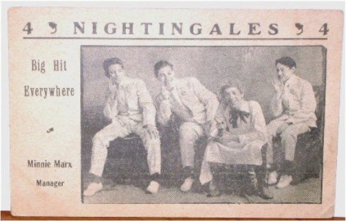 As is generally the case with a good Marx Brothers story, this may be exaggerated or totally fictional. (Julius remembers Adolph shitting his pants, so take it all with a grain of salt.) If Adolph’s little accident really happened, then the audience didn’t notice. The Four Nightingales were a success at Henderson’s Music Hall, and played there a full week. Then the road beckoned, and the boys (and ever-present Minnie) hit the circuit. York, PA…Lima, OH…Tampa, FL…Wheeling, WV…Richmond, IN…the road went on and on as 1908 turned to 1909. Adolph developed a passable enough singing voice to “growl” the bass parts. At the same time, Julius recalled that as he and Milton reached the end of their teens, their formerly sweet singing voices had begun to coarsen. Lou Levy had to carry the primary musical load as lead vocalist.