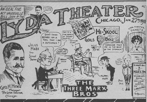 “The jaded man or woman who wants to drive dull care away and be taken back to the happy days of childhood should go to the Majestic this week and see the school act which the Three Marx Brothers and three pretty girls are presenting,” said an appreciative Rockford Morning Star. “Here is a rollicking quarter hour’s entertainment which is as full of fun and frolic as anything that has been seen in this theater for a long time. The school act includes seven players; three comedians, three girls, and the ‘schoolmaster’ is also there with the comedy stuff. It is a joy to watch the spirit with which the little play is given, and its brightness and fresh fun is certain to please all children from seven to seventy.”