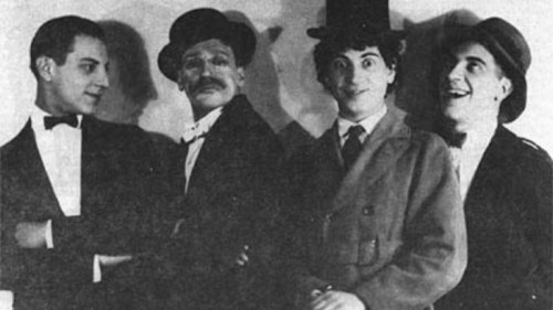 The Marx Brothers in On the Mezzanine Floor, Fall 1921. Groucho and Chico haven’t quite dialed in the iconic costumes we all know (Groucho in a bowler hat?), but that’s definitely a greasepaint mustache on Groucho (the eyebrows would come soon)