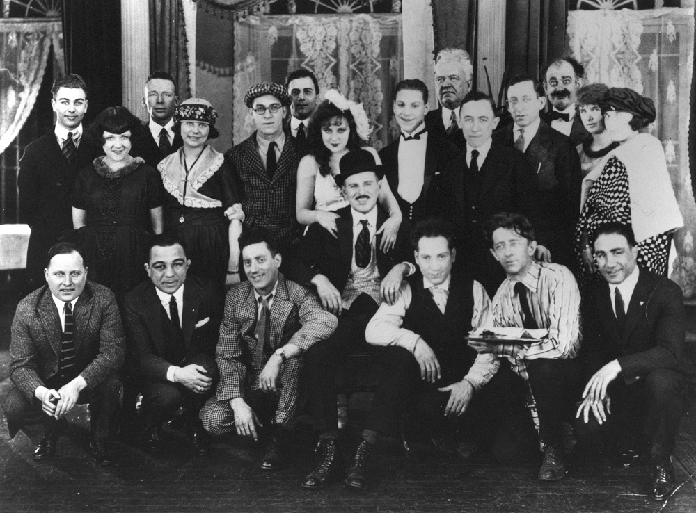 The Humor Risk company, spring 1921. Director (and possible lead actor) Dick Smith is at the center, with Jobyna Ralston draped seductively on his shoulders. Groucho and Harpo each have an elbow on one of Smith’s knees. Chico, looking very natty in a checkered hat and coat (and his rarely-seen glasses), is to the left of Ralston. Zeppo is in evening dress to her right. Ruth Marx is to the left of Chico.