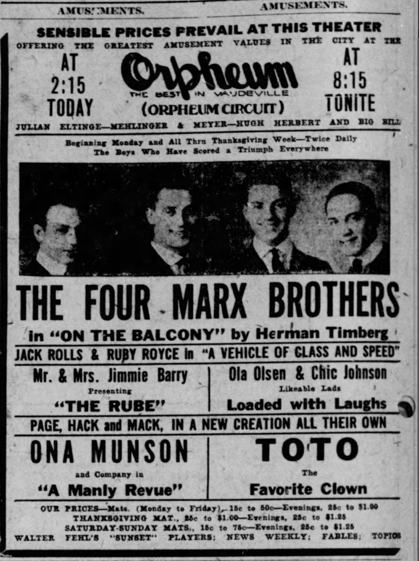 Staying close to home and playing the multitude of theaters in the five boroughs and New Jersey was all very nice, but it was inevitable that the show had to hit the road on a national tour, starting with Dayton, Ohio in October of 1921. Increasingly, the show was performed and advertised as On the Balcony (maybe they suspected some rural audiences wouldn’t know what a “mezzanine” was?) Everything was going swimmingly…except the Brothers were getting a little perturbed that every glowing review seemed to credit Timberg as the production’s mastermind, and his name was always featured prominently in the show’s advertising. The situation was resolved to all parties’ satisfaction. The Marx Brothers simply paid the Herman Timberg Producing Company a flat fee of $10,000 and bought the whole show, lock, stock, and mezzanine. Timberg moved on to other projects, Benny Leonard had already pocketed a nice return on his investment, and everyone remained friends. Timberg’s name disappeared from the ads. The only downside was Hattie Darling dropping out of the show. Her parents forbid her from marrying a boxer, thus ending the relationship and, effectively, her stage career. Darling was replaced by the seventeen-year-old newcomer Helen Schroeder…who would go on to change her name to Helen Kane, have a huge hit song with the baby-voiced “I Wanna Be Loved By You” in 1928, and serve as the model for cartoon character Betty Boop. (She unsuccessfully sued over likeness rights.)