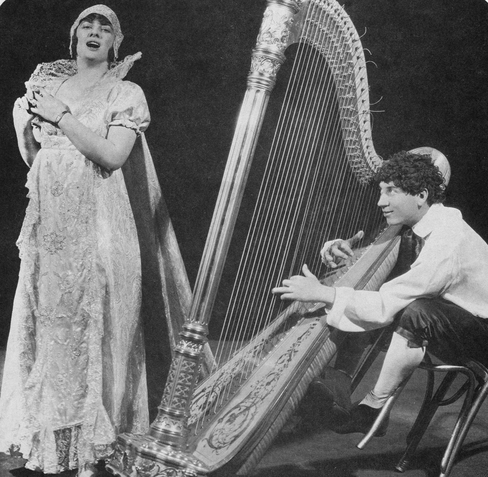 The reviews hit the newsstands the next morning. They were an almost-universal smash. The chorus of approbation was led by the New York World’s distinguished top theater critic Alexander Woollcott, one of the most-quoted men of his generation. Woollcott praised the show in general, but reserved several lines of particularly fulsome praise for Harpo. This was not unusual for the era. Smartass Groucho is usually the modern viewer’s favorite, but at the time, his caustic wisecracks and non-sequiturs were often a little rough-edged for audiences to fully embrace. It was Harpo, the child-like silent clown and brilliant harpist who won the affection of the old-fashioned folks whose tastes were still rooted in the 19th century. In his review for Life magazine, Robert Benchley said “The pantomime of Mr. Arthur Marx…is 110 proof artistry. To watch him…at any moment of during the show, is to feel a glow at being alive in the same generation.”