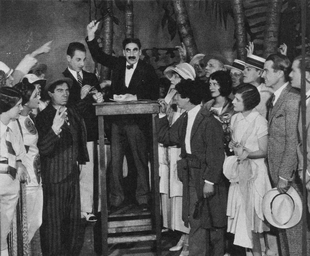It was a popular hit as well, with repeat business guaranteed. Audiences wanted to catch the fresh ad-libs, or the changes in the script that successful previous ad-libs had wrought. “Somewhere in the second act, I think I heard one of the original lines,” Kaufman is said to have remarked deep into the show’s run. By June of 1926, so many changes had been made that the official script was totally re-written, and they advertised it as the “Summer Edition” of The Cocoanuts. (Ryskind estimated the “Summer Edition” was about fifty percent new material, including the classic “why a duck?” routine.)