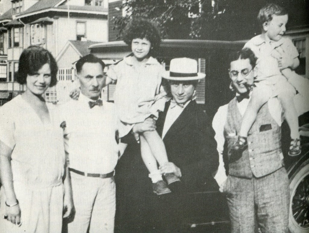 The long runs of I’ll Say She Is and The Cocoanuts allowed the Brothers to establish domestic lives in the New York area. Pictured in front of Minnie and Frenchie Marx’s home in Richmond Hill, Queens are (l. to r.) Ruth Marx, Frenchie, Maxine (Chico’s daughter), Harpo, Groucho, and Arthur Marx (Groucho’s son), who looks about two inches away from a cigar burn on his thigh, c. 1924