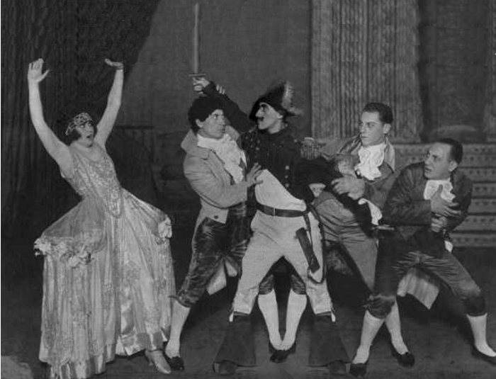 Co-written by Johnstone and Groucho, who at last was elevated to the long-desired level of Professional Writer, the sketch depicts Napoleon (Groucho) bidding farewell to Josephine/Beauty multiple times and leaving her room…then returning on some pretense, sending her three suitors (the other Brothers) scrambling for a hiding place. Both the courtroom sketch and the Napoleon sketch strayed pretty far afield from the “give the heiress a thrill” plot, but no one cared — it was just a revue. (All right, if you must know, the courtroom sketch was slotted in as part of Beauty’s thrill of being a criminal, and the Napoleon sketch came from Beauty’s thrill of…well, being put in a hypnotic trance and made to believe she is Josephine. See how flimsy these revue plots were? Just an excuse to have a courtroom sketch and a Napoleon sketch.) As indicated, Beauty realizes love is the biggest thrill, and ends the show after the last big musical number in the arms of the various handsome male leads who assayed the role of the Chief during the show’s run (including, briefly, Chico’s old partner Arthur Gordoni). What he was supposed to be the Chief of is never really explained. The harp and piano numbers were mixed in there somewhere, too. The show ran two hours and forty minutes on a fast night.
