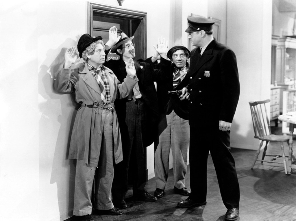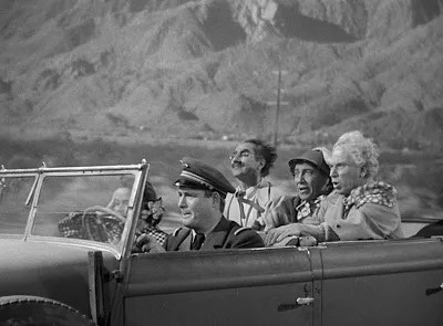 Movie making was not as cushy as they remembered. They were all well into their fifties, and their energy lagged. In an on-set interview in November, Harpo remarked “It’s just too much work.” In the same interview, Groucho said “The only reason I’m making this picture is because in five years I’d forgotten how miserable it could be.” But they were hopeful about the movie itself. “The picture may turn out surprisingly well,” Groucho wrote to his daughter. “The last reel is a wild chase, apparently a basic requisite for a comedy. I think it’s quite ingenious and pretty exciting.” (Is this the same Groucho?)