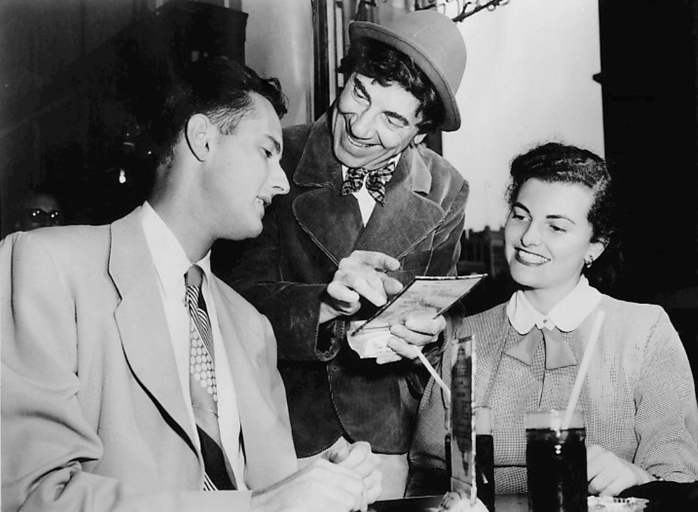 Chico had an old-school performer’s disdain for television, and said that it “ruined comedy.” But performing on television was just the sort of soft racket that could keep the money flowing in. He was the first Marx Brother to appear on TV, playing piano on an episode of Texaco Star Theater in October of 1948. After a few other (now lost) appearances on different shows, he eagerly accepted a main role on an early musical sitcom, The College Bowl, playing the proprietor of a soda fountain where all the college kids hung out (and frequently sang). Chico dispensed ice cream sodas and fatherly advice to the clean-cut youngsters, still with his Italian accent. (One of the college boys was Andy Williams). It only lasted one season (1950-51), but Chico didn’t mind too much. Early television was hungry for content, and there seemed to be no shortage of options for cashing in on his famous name and keeping his bookies happy.