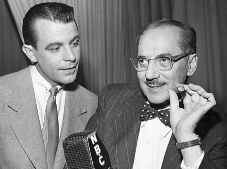 Bob Hope was hosting a star-studded, one-shot radio special sponsored by Walgreens drugstore in April of 1947. The show began to run long, and guest star Groucho was getting irritated and impatient waiting for his cue. When it finally came, he ignored the script and began a long and hilarious improvisation with Hope. Listening backstage was John Guedel, producer of Art Linkletter’s game show People Are Funny (and inventor of the concept of a “re-run.”) He was struck by Groucho’s skill at ad-libbing, and realized that Groucho’s failures in radio were due primarily to sticking to the rather corny scripts that dominated radio variety in those days. Guedel approached Groucho about hosting his own radio game show, one where he could improvise freely. Groucho was dubious, but agreed to look at whatever proposal Guedel came up with.
