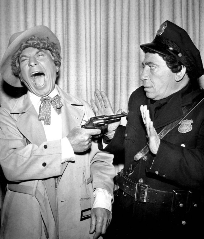 Chico joined Harpo in silent pantomime for CBS’s General Electric Theater episode “The Incredible Jewel Robbery.” The thirty-minute piece was intended to be a throwback to old two-reel silent comedies, and aired on March 8, 1959. Marx biographer Simon Louvish describes it as “beyond sad.” At this point, Harpo and Chico’s deeply-lined faces look downright disturbing peeking feebly from under their curly comedy wigs (wigs don’t wither away from arteriosclerosis). The only thing incredible about it is how loud the obtrusive canned laugh track is. The episode surely would have been completely forgotten had not Groucho popped up in the last few seconds, marking the final time the three performing Marx Brothers appeared on a screen for public consumption.