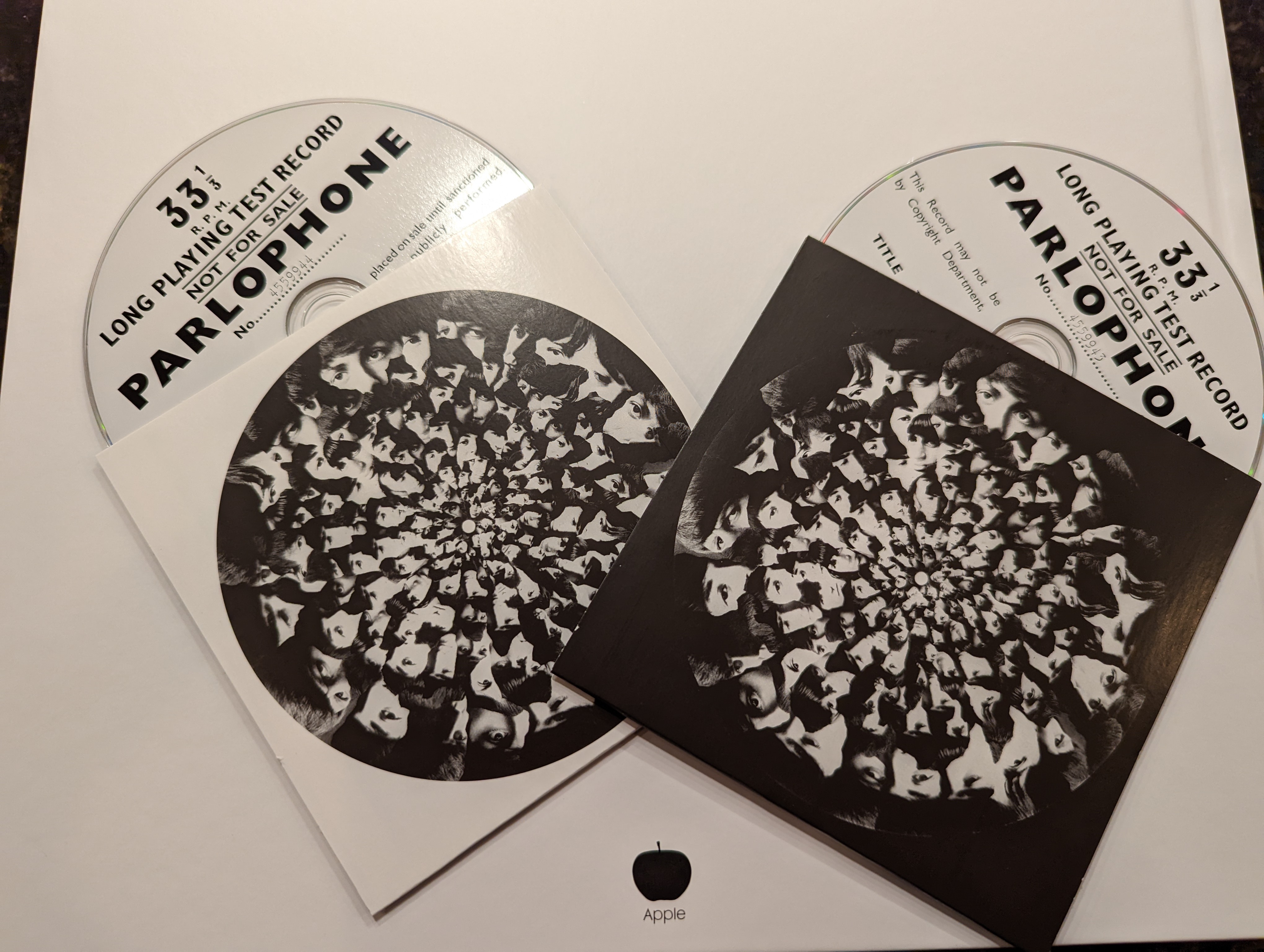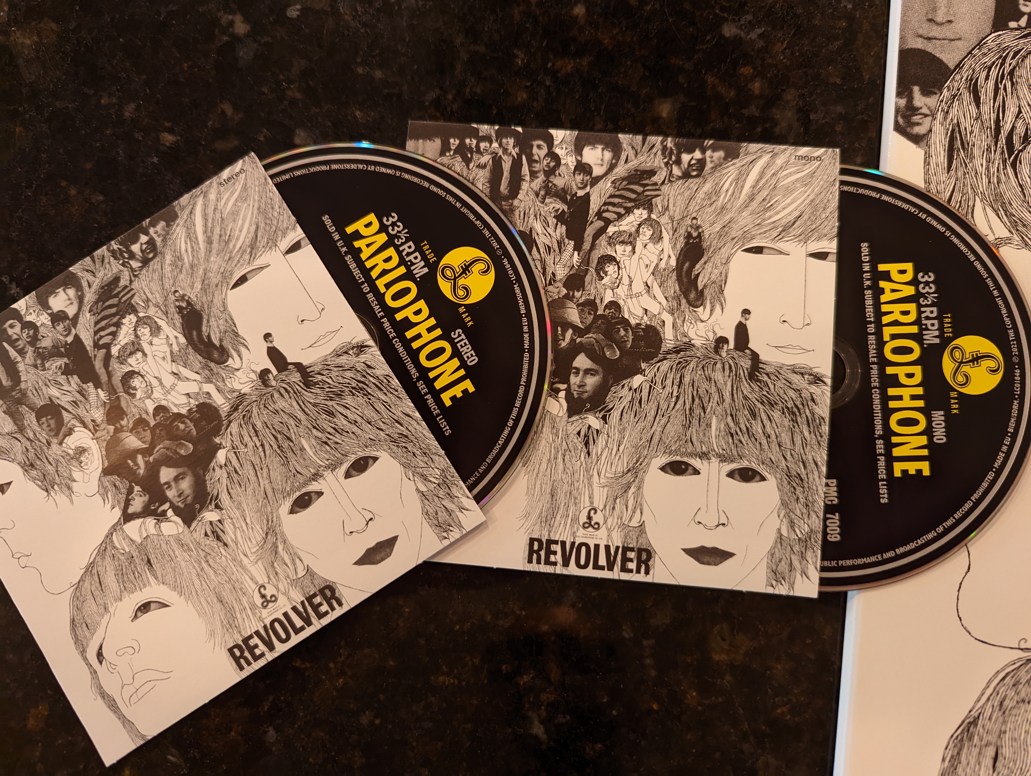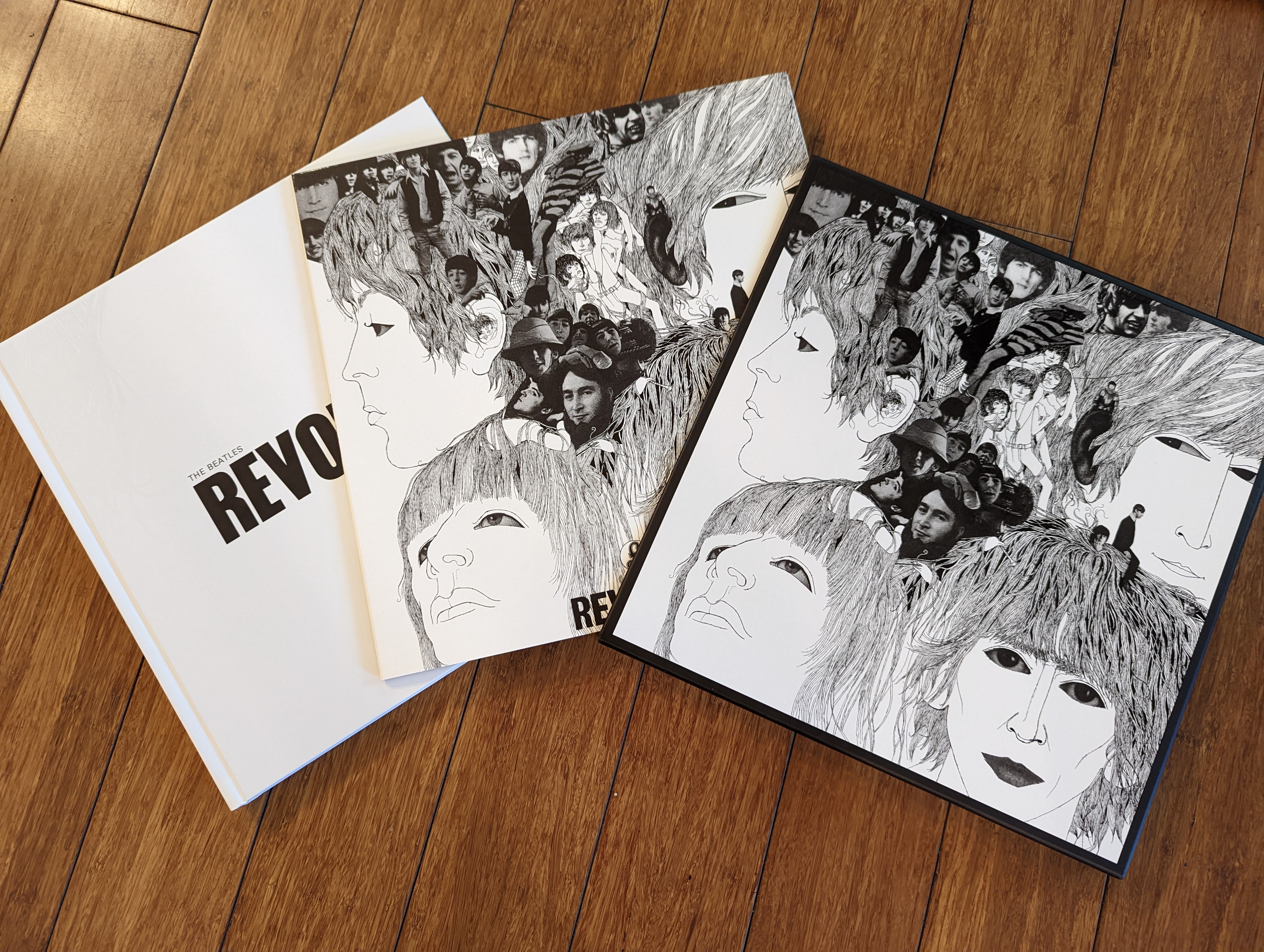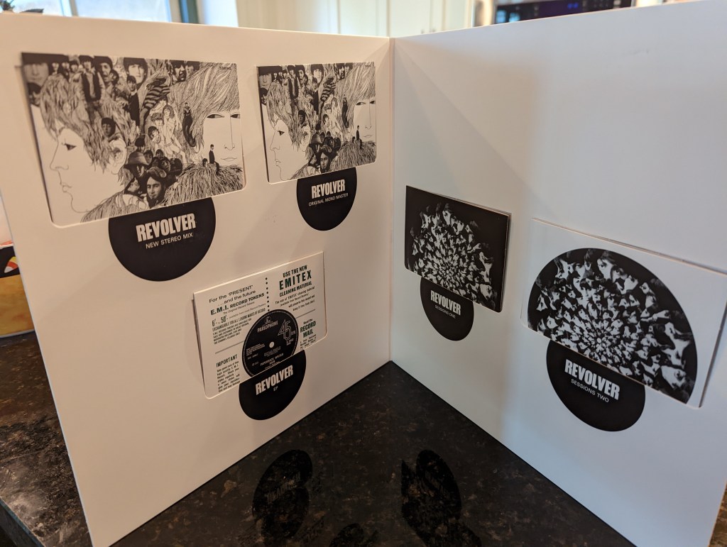 Five compact discs — a new stereo mix, the original mono mix, two discs of outtakes, and an “EP” of of “Paperback Writer” and “Rain.” The album’s track list represents the album’s official British release. The inferior American version was three songs shorter (all Lennon songs, lopped off to appear on the U.S.-only Yesterday And Today album earlier that summer). Click here to read the Holy Bee’s take on the differences between U.K. and U.S. Beatles albums.