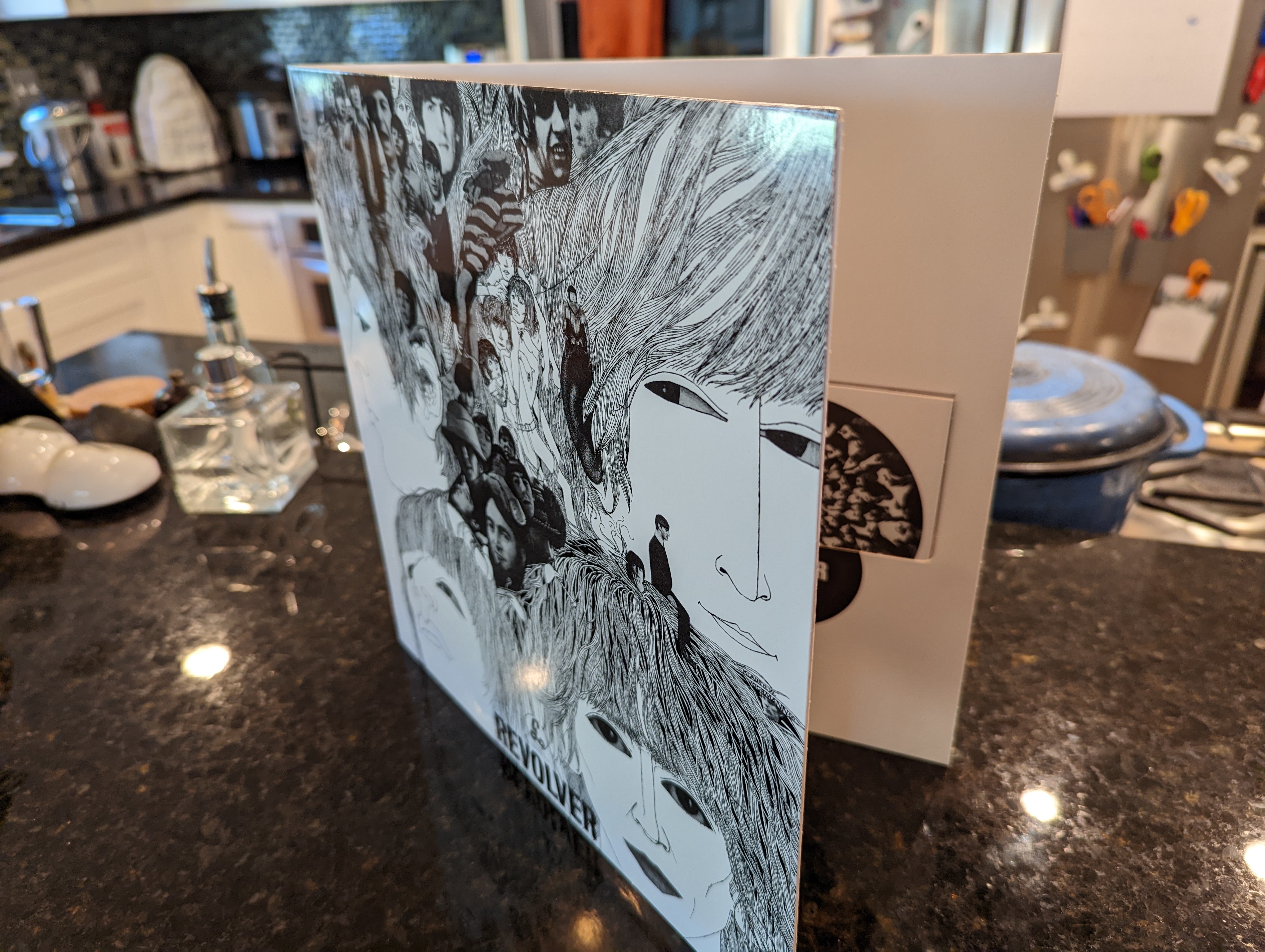 The iconic, monochromatic Grammy-winning cover art by long-time Beatle associate Klaus Voormann, whose face can be seen peeking from George’s hair (just under John’s mouth).