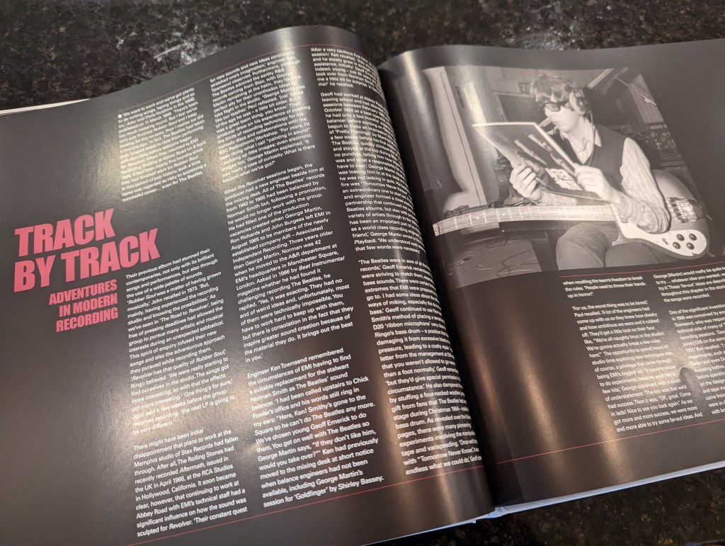 “Assured and almost aggressively self-confident, the Beatles took their undisputed mastery of pure songcraft (melody, rhythm, lyricism, etc.) into the studio during their first long break from touring, and delved into a bag of production tricks and techniques that are still being emulated to this day. Varispeed, tape loops, flanging, phasing — all of which can be done in the modern era with the click of a mouse, but in 1966 required a pioneering spirit and a willingness to push the limits of recording at all times. It required thinking way, way outside the box, and altering (sometimes even damaging) microphones, instruments, amps, and four-track tape machines. (Yes, it was all done on four-track!)