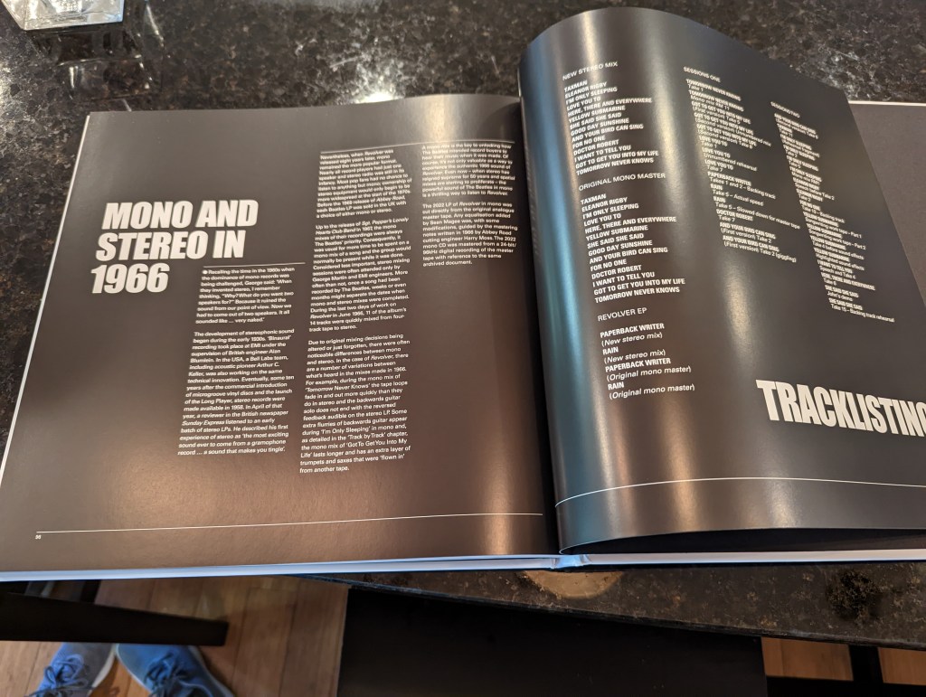 Giles Martin & Sam Okell‘s new stereo mix, and the orginal mono mix. Although mono sound is a relic these days, the Beatles always preferred mono for their material, and lavished most of their attention on the mono mixes of their songs, so they’re always worth having if you want to hear the songs “as intended.”