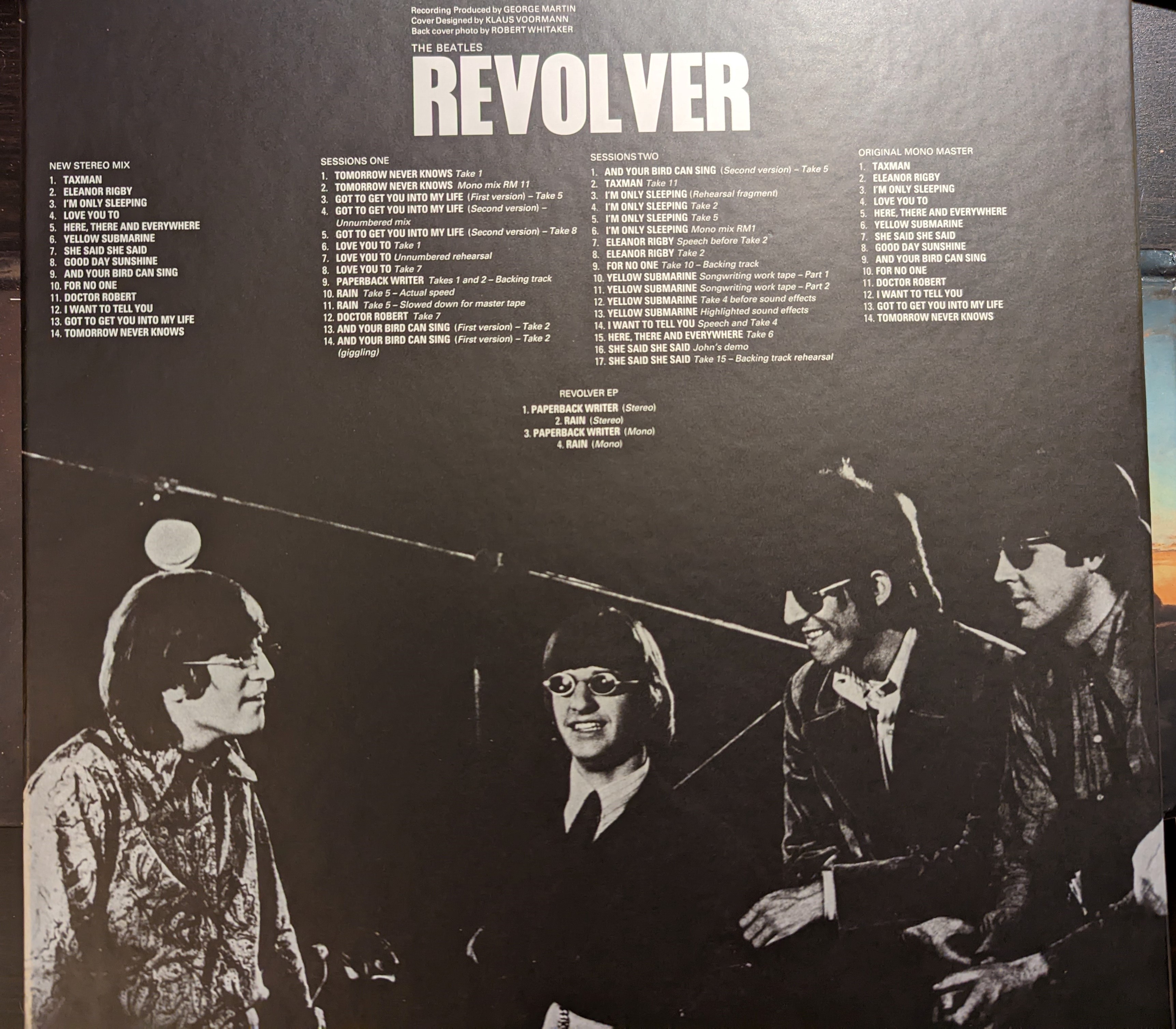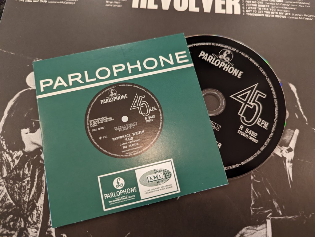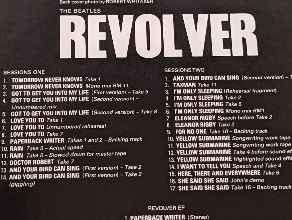 The Revolver sessions (April-June 1966) not only produced the fourteen tracks on the album, but an additional two (“Paperback Writer” and “Rain”) released as a single. The mono and stereo versions of both songs are presented here as a four-track “EP” — a throwback to a format that had some popularity in Britain, but never really took off in the U.S. (Does the Holy Bee have some thoughts on the EP format? You bet your boots he does.)