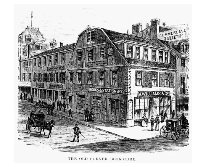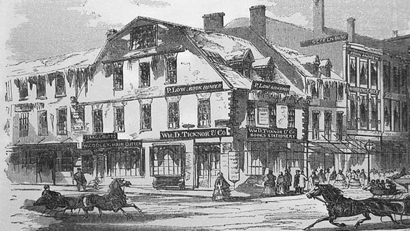 With a new address of 135 (now 283) Washington Street, the building hit its stride as a book shop when it was occupied by the firm of Ticknor and Fields for over thirty years in the mid-1800s. Not only did they sell books, they were also innovative publishers who invented the concept of author royalties, and published important works of the great New England writers of the era such as Emerson, Thoreau, Hawthorne, Longfellow, Stowe, Alcott, along with the American editions of the novels of Charles Dickens. Not only did the company publish and sell these works, the site itself became something of a literacy center and salon, where the authors would frequently drop by to talk shop with each other, their publishers, and their readers.
