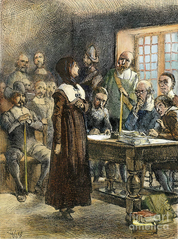 The charismatic Anne Hutchinson — “of ready wit and bold spirit,” according to Winthrop — was definitely the dominant force in the household. She had borne fourteen children before leaving England for Massachusetts, eleven of whom survived to make the journey with her and William. She became a midwife and spent her days ministering to the sick and needy. Her frequent dispensing of spiritual advice led to her hosting a women’s Bible study group that was instantly popular. The First Church in Boston, a Congregationalist assembly that met just a few yards up Cornhill from the Hutchinson residence, was frequently ministered by Anne’s religious mentor, John Cotton. Cotton and Hutchinson became more and more critical of Puritan orthodoxy. Her post-church meetings began attracting curious men, many of whom found themselves nodding in agreement at her pronouncements. Even colonial governor Henry Vane, occupying the office during the few times Winthrop wasn’t, was known to be a huge A.H. fanboy. Hutchinson began pushing her controversial (for a Puritan) opinions even further, and often made showy point of stomping out of services ministered by those she disagreed with (followed by a retinue of devoted supporters). She soon found herself in hot water with the local authorities. She could out-debate any religious scholar, had an answer for everything, and her interpretations of Biblical teachings made a whole lot of sense to those who approached them with a bit of critical thinking.