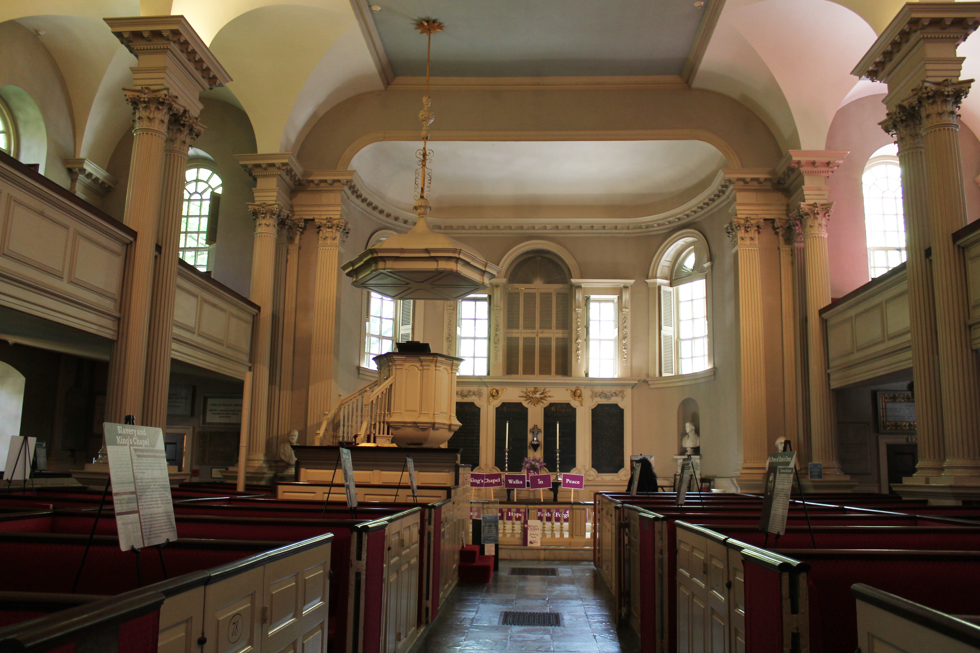 About sixty years later, the original wooden chapel was overcrowded and in a state of disrepair. A new granite King’s Chapel was built around the original structure while services continued uninterrupted, to ensure the land did not revert to the Puritans if the original structure was demolished. Only when the new chapel was completed in 1754 was the old one dismantled, and carried out in tiny bits through the windows of the new structure. The original box pews, communion table, Corinthian columns, and pulpit were kept. The pulpit, dating from 1717, is America’s oldest pulpit in continuous use in the same location.
