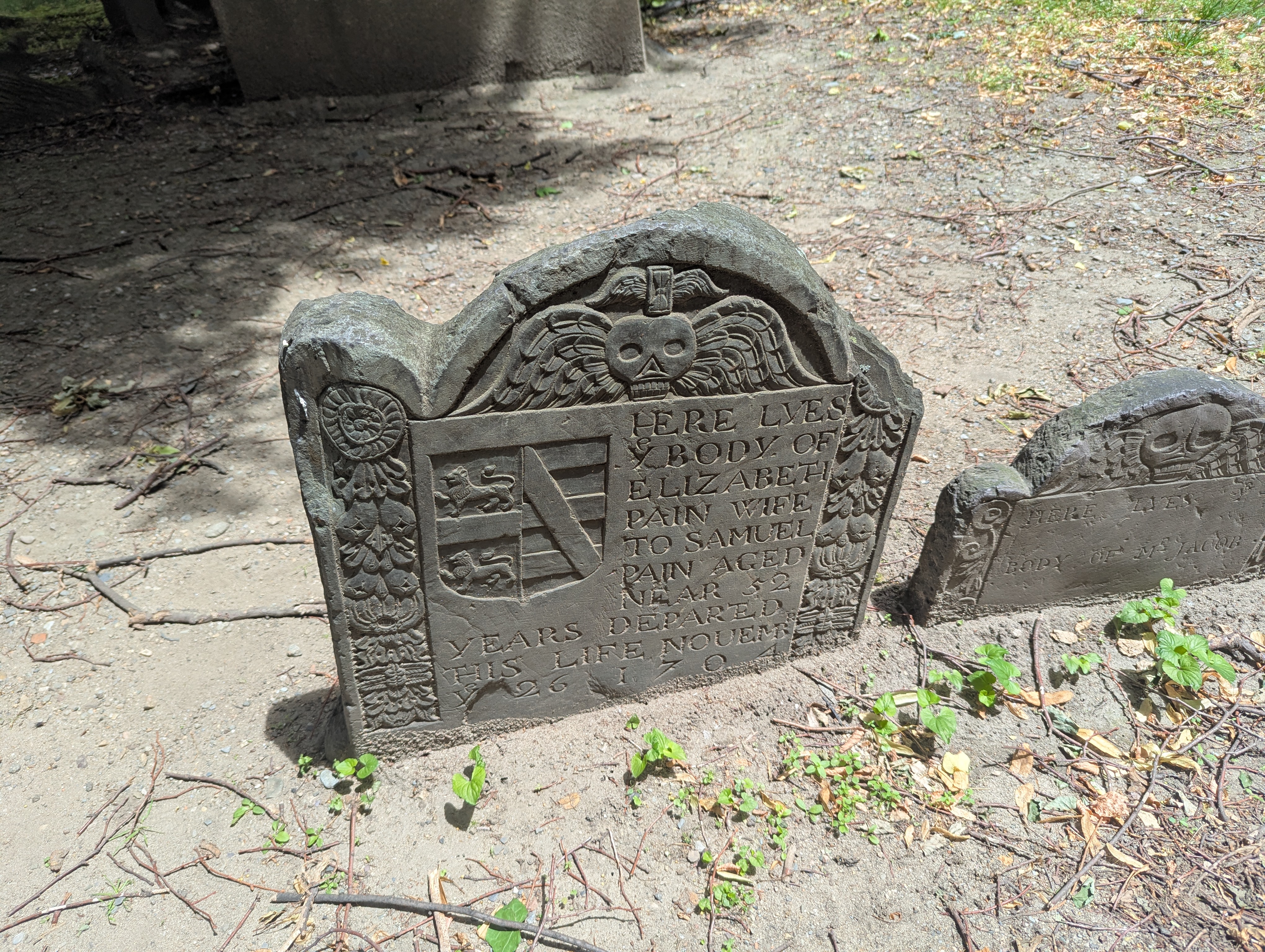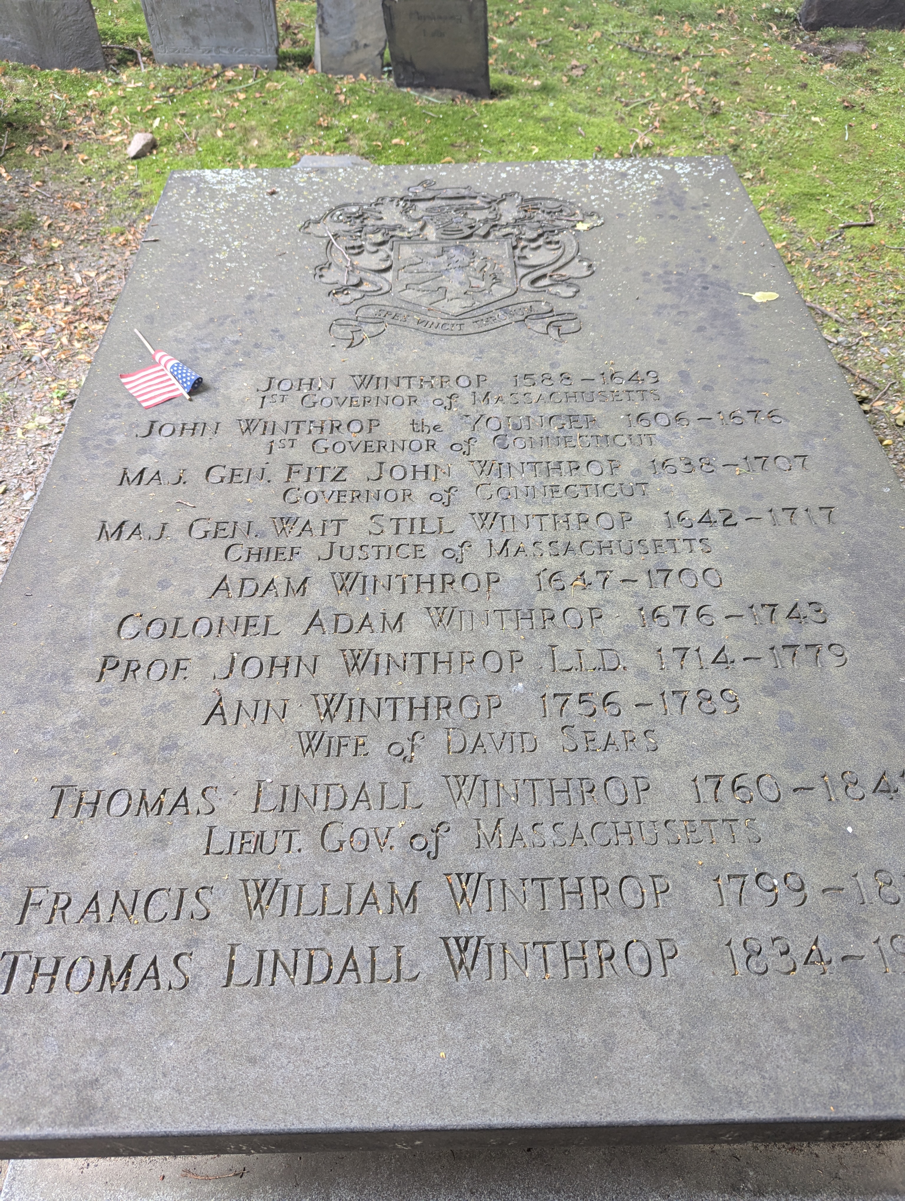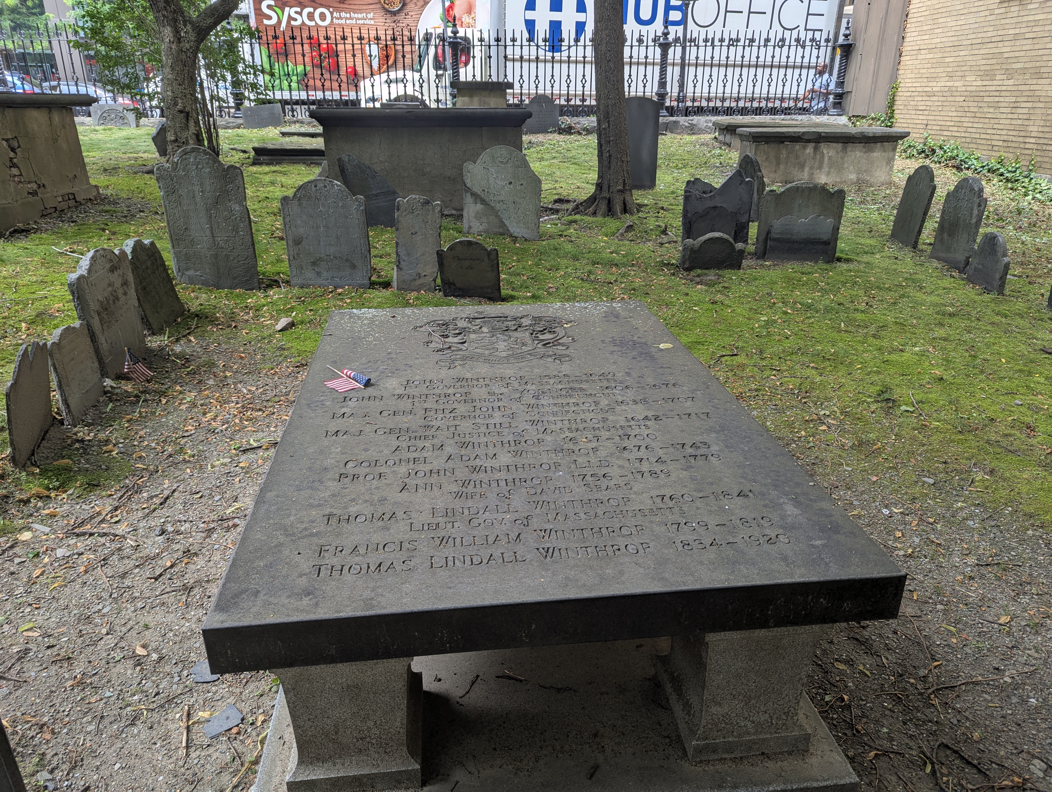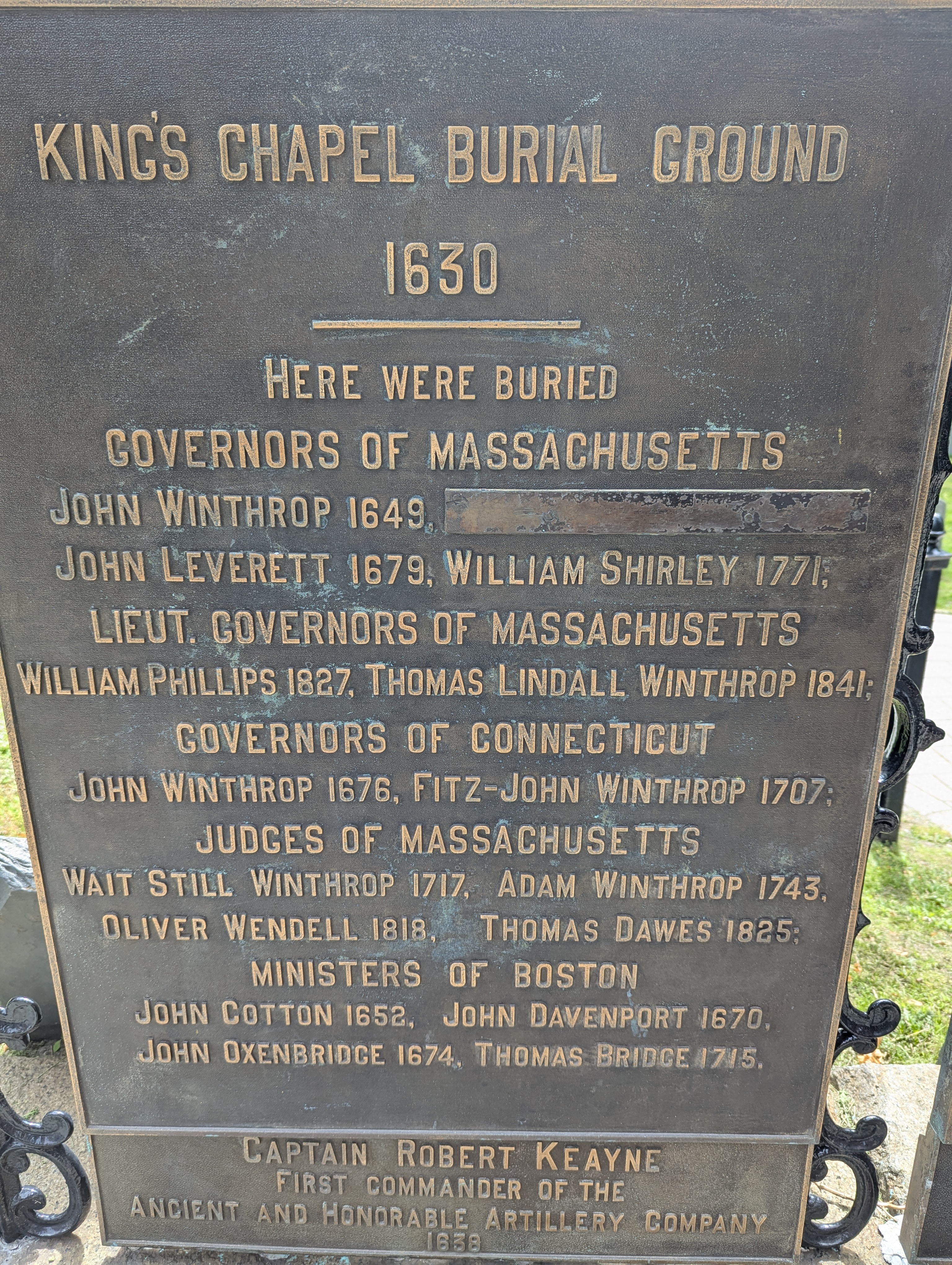 The graveyard remained an active burial site until the 1800s, and as was the norm, the bodies were really jammed in there. The less than half-acre site contains more than 1,000 former people. About 600 tombstones remain visible, but like the Granary Burying Ground, do not necessarily correspond with the location of the person named on it. The most notable burial here is probably John Winthrop, often referred to as the Massachusetts Bay Colony’s first governor. That distinction actually belongs to John Endecott, who for many years was thought to be buried here as well, but analysis of local records uncovered that he is actually entombed in the Granary Burying Grounds (lord knows exactly where). Endecott’s name has been noticeably removed from the plaque on the entrance gate. (The quibble over who was the first colonial governor comes down to being appointed by the company that founded the colony — as Endecott was in 1629 — or elected by the residents of the colony — as Winthrop was in 1630.)